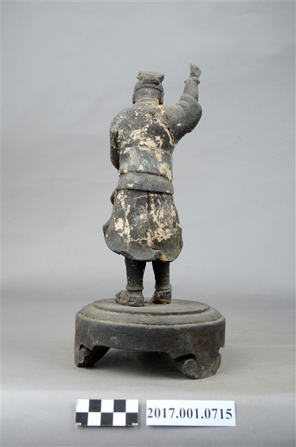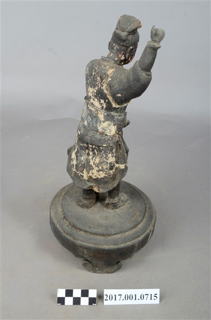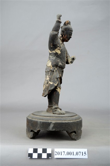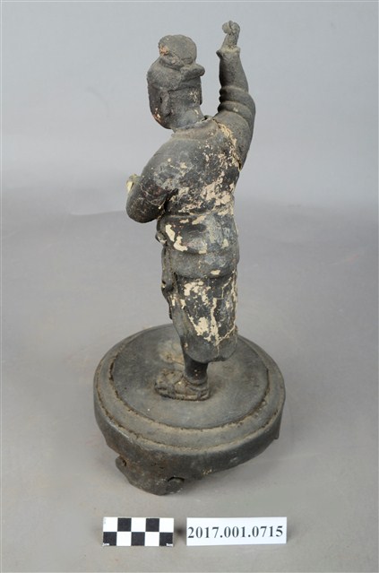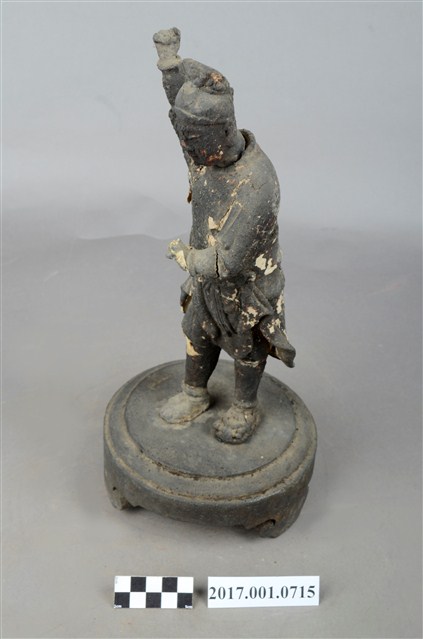 1.本件泥塑馬使爺像,作立姿姿態,表面施作塗裝粧佛技法,表面佈滿污漬。張眼,鼻樑短。頭戴軟巾,身著窄袖及膝短衫,腰束護腹,雙腿穿長褲打綁腿,腳穿草鞋。立像挺身站於臺座上,身軀略為向前,右腳向前、左腳在後,作行走的姿勢,左手橫伸向右,左手掌伸二指收三指,二指斷裂缺損,右手握拳持物高舉過頭,物件已失。三腿圓形臺座之腿部作如意造形。本件判斷為馬使,在於裝束穿著,右手高舉應是手持馬鞭。
