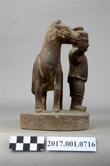 1.本件馬使爺像為木雕,表面粧佛已經褪去。馬使爺頭戴圓巾,身穿短褐長褲,腳穿長靴。圓臉大眼,表情憨厚。左手插腰,右手抬起作拉繩狀。馬披馬鞍,站立於馬使爺背後。