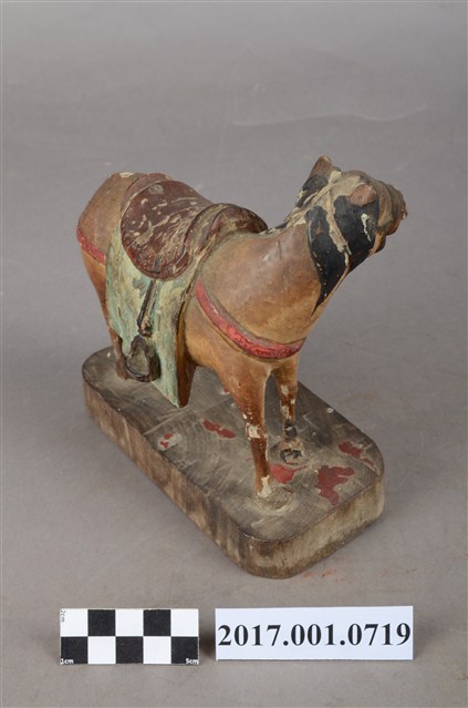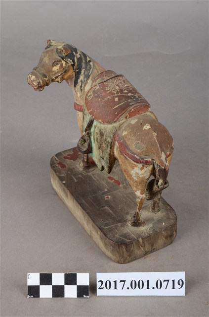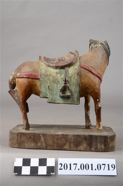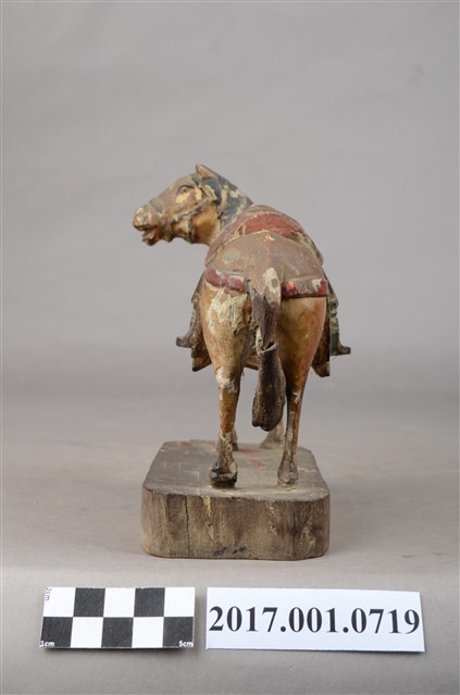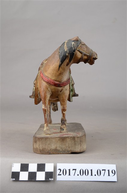 1.本件木雕馬爺像,採立姿姿態,表面施作塗裝,局部漆面剝落。馬爺的頭部勾首向前,頸背上有馬鬃,馬尾垂下,馬頭佩戴絡頭,馬背裝設馬鞍、障泥、馬鐙,身軀有攀胸、鞦。四足站立,馬足下有方形臺座。