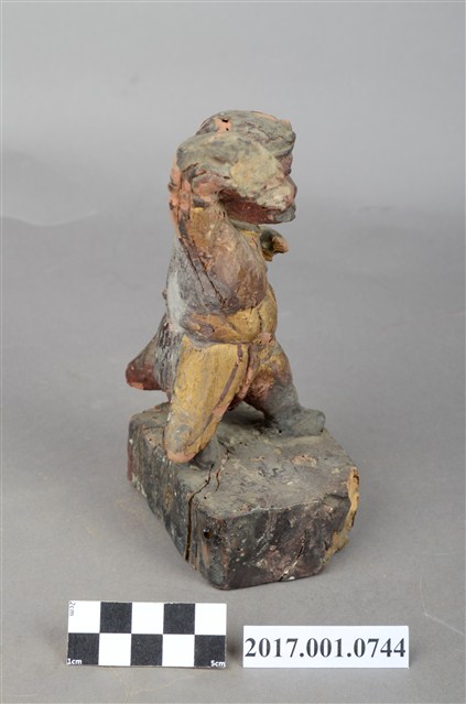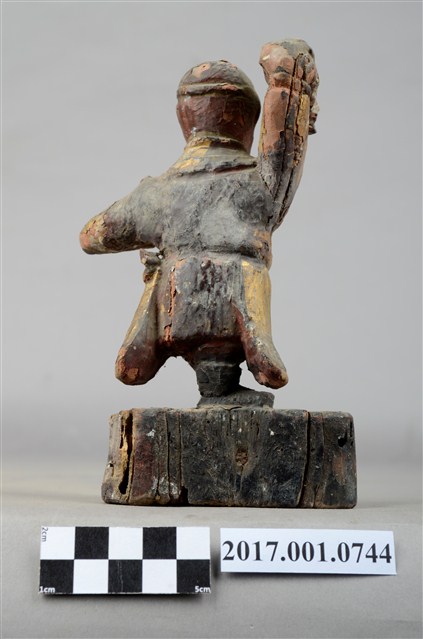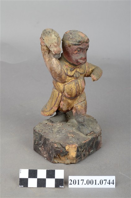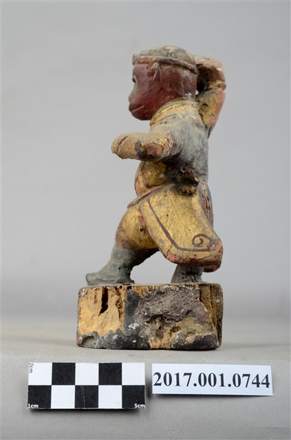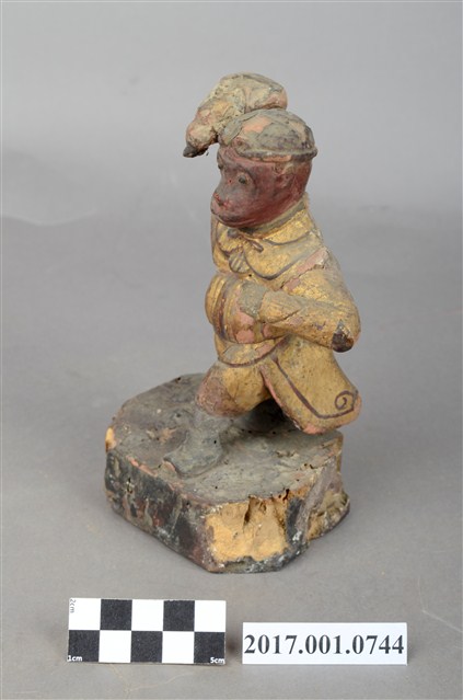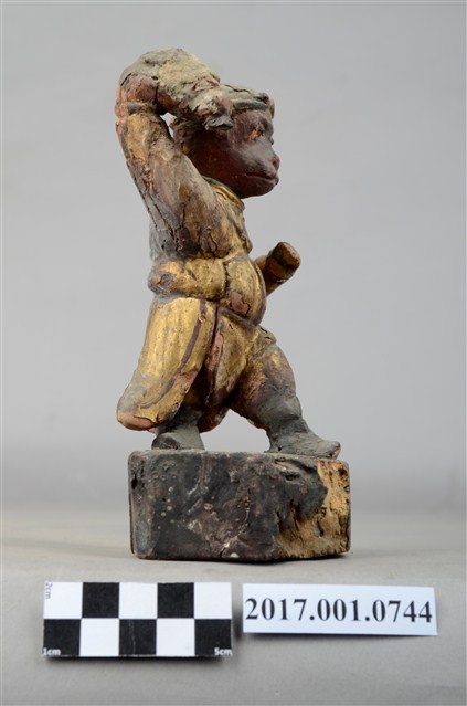 1.本件孫悟空像為木雕製成,表面施作塗裝、安金不見紅。孫悟空雙眼炯炯有神,頭戴金箍,身穿窄袖長袍,右手持紅色葫蘆,左手橫伸於胸前,雙腳穿皂靴以丁字步的方式站立。