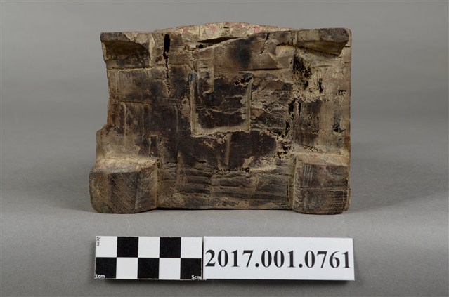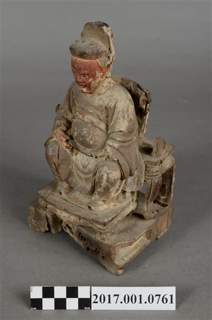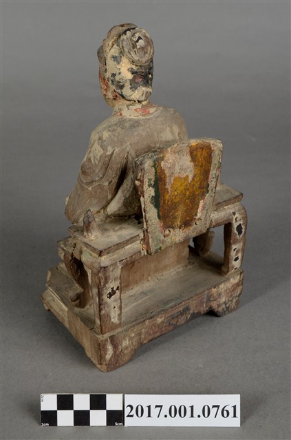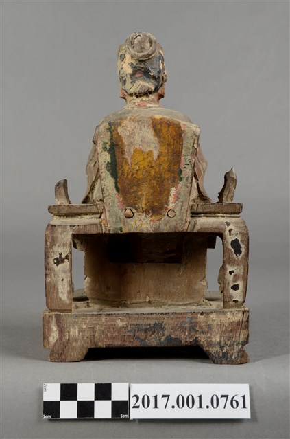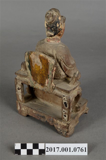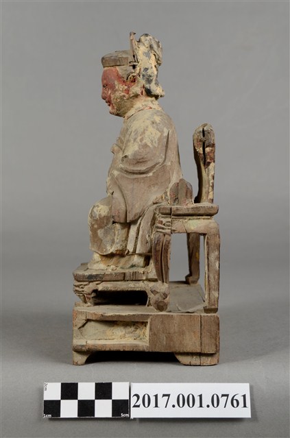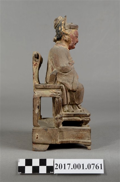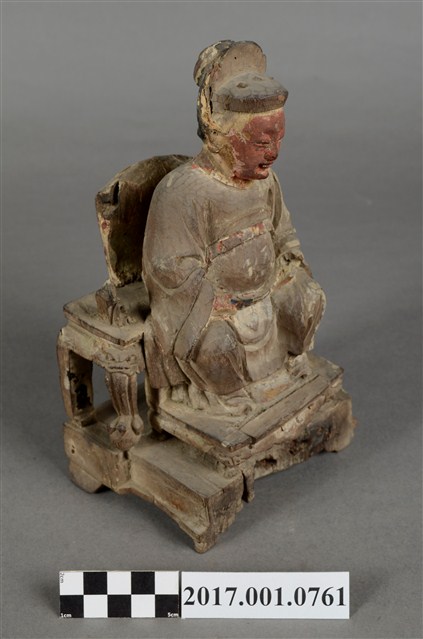 1.本件木雕註生娘娘像採坐姿,表面粧佛已除去,註生娘娘坐於一圈背椅上,木椅鏤空,兩側扶手缺損,椅下另有一方形四短足的臺座。註生娘娘頭梳圓髻,頭戴幞頭,臉型圓潤,臉上紅漆,面相莊嚴慈祥。註生娘娘雙足下垂,腳著弓鞋,足下踩有一小型踏几。身著圓領袍服,腰束玉帶,胸前束看帶。雙手手肘微彎,右手握腰帶,左手持一註生簿,簿冊上方已缺損。