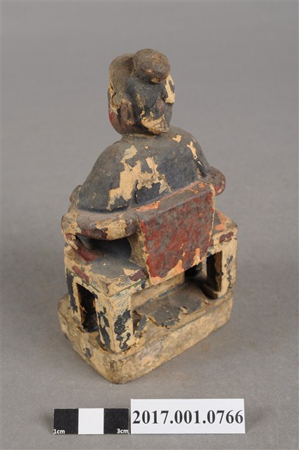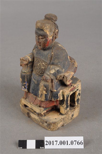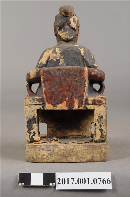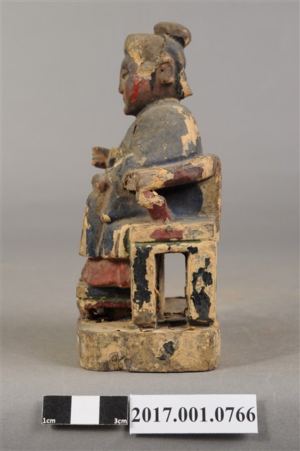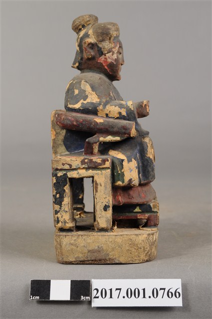 1.本件木雕註生娘娘像,表面施作塗裝、粉線盤飾粧佛技法,局部粧佛剝落。髮梳髻盤於腦後,顏面雙目半睜,身著盤領衣,雙腳套弓鞋,坐於圈背椅上。端坐,左手握拳置於左膝,右手握拳持物舉起,持物缺失。圈背椅兩側扶手的出頭已缺失,圈背椅前有踏几,椅下為臺座。