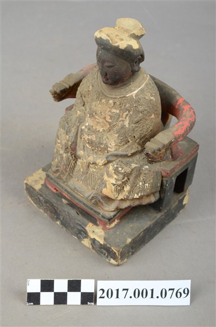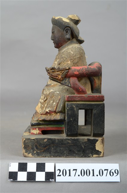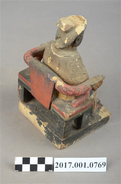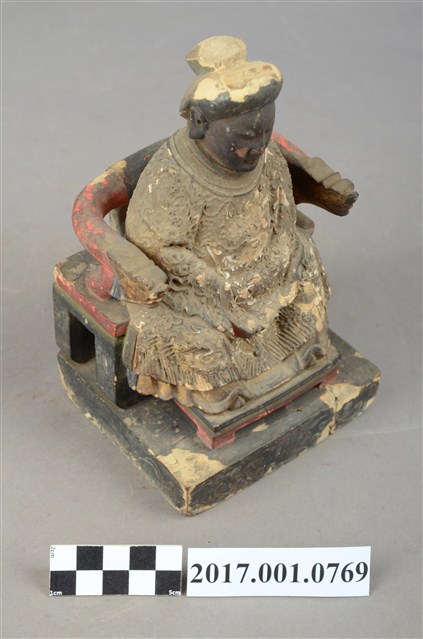 1.本件木雕註生娘娘像採坐姿,尺寸微小,表面有粉線與彩繪粧佛。註生娘娘坐於一圈背椅上,椅下另有一方形臺座。註生娘娘頭梳圓髻,臉型圓潤,臉孔莊嚴慈藹。註生娘娘端坐,雙足自然下垂。雙手相疊微靠身右腰前,呈抱袖狀,雙手藏於衣袖內。