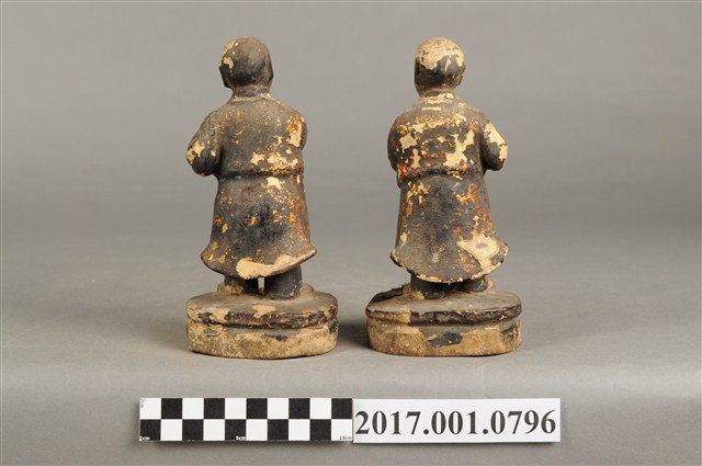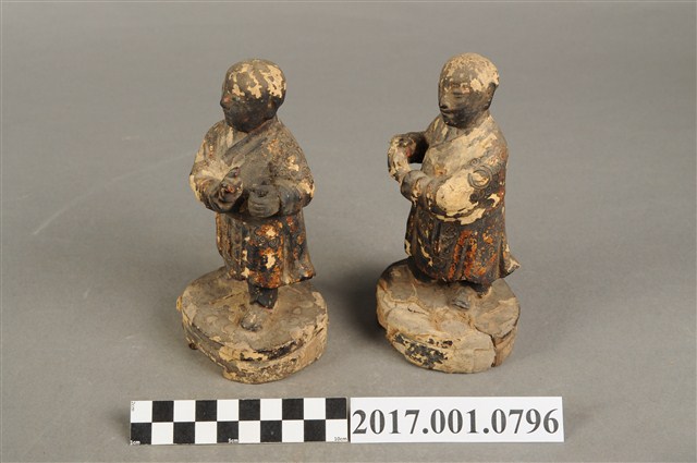 1.本件木雕童子像兩位成組配對,為主祀神的左右從祀。皆採立姿持物的姿態,以木雕製作方式,站在一木製臺座上,表面施作塗裝、安金不見紅粉線盤飾粧佛技法。兩位童子顏面表現幼童相貌,嘴微開,身著右衽窄袖長袍,腰繫布帶,腿著長褲,腳穿履。立像挺身以雙足丁字步的姿態站於臺座上,雙手手勢相反。