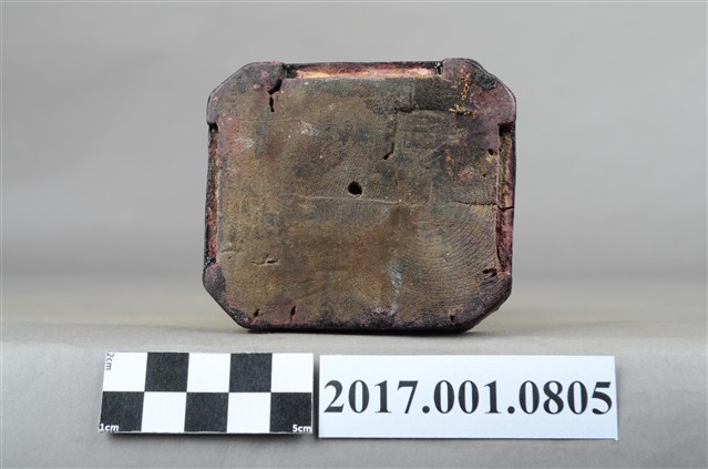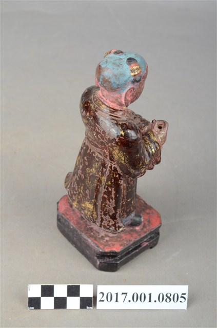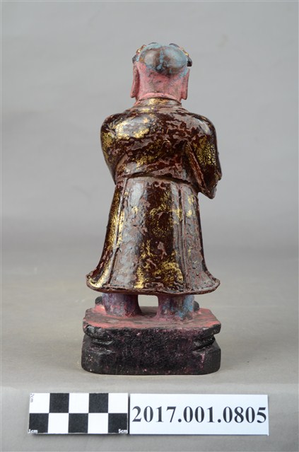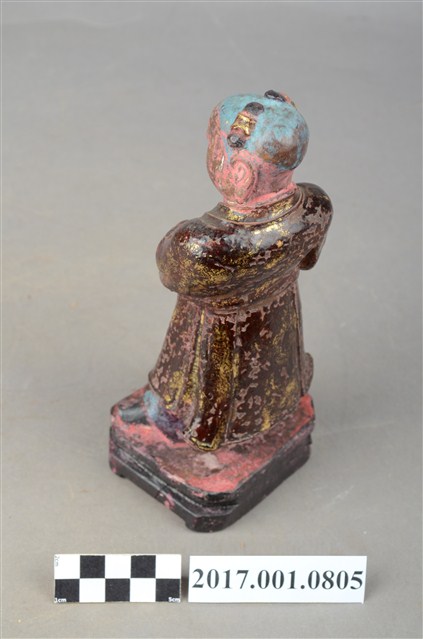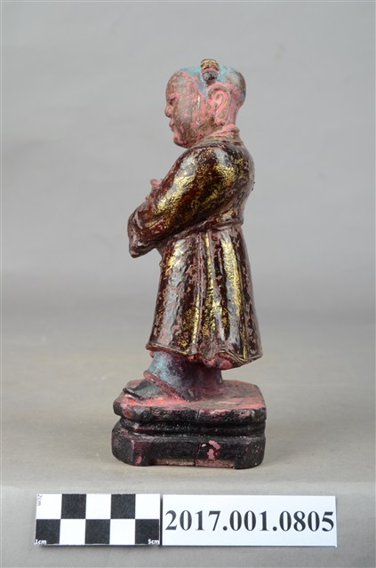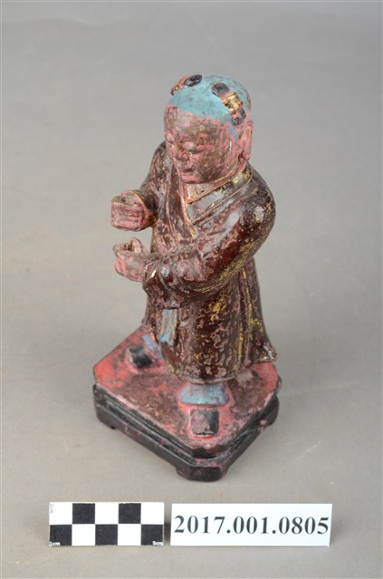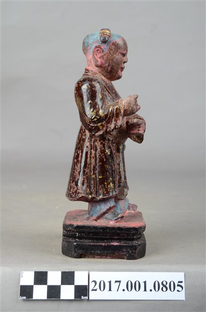1.本件木雕童子像,作立姿姿態,表面施作塗裝粧、安金不見紅妝佛技法,局部漆面剝落。短髮。頭頂兩端梳雙髻,上半身著左衽窄袖長衣,下半身著長褲,腰繫布帶,雙腳穿履。立像挺身以雙腳丁字步的姿態站於臺座上,左腳前伸,雙手虛握,右手置於左手上方作合持桿狀物狀,持物已失。本件臺座表現案几形式,臺座底下中間有孔,推測是機器雕刻所留下,因而時間判定為戰後。