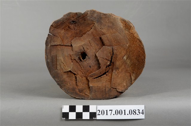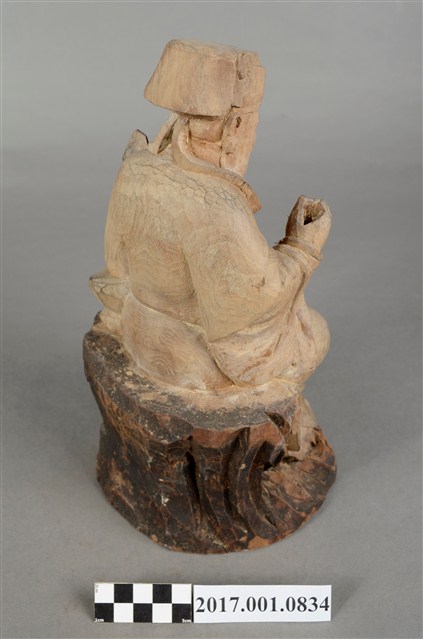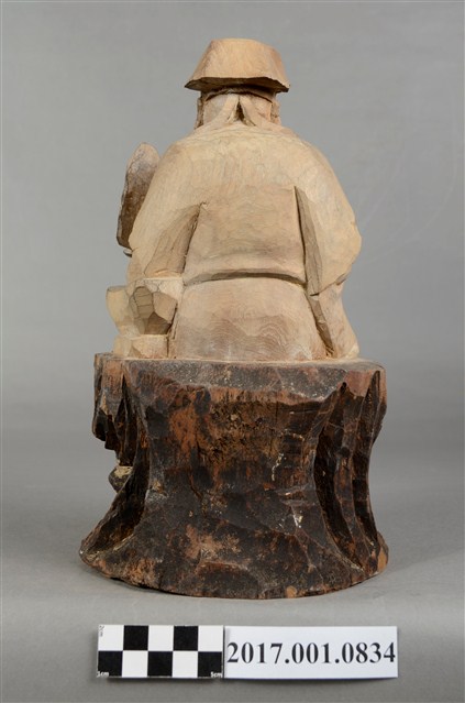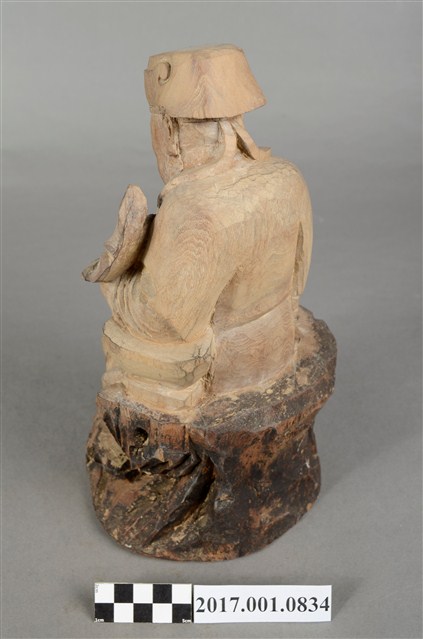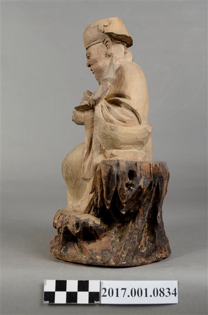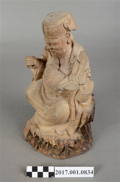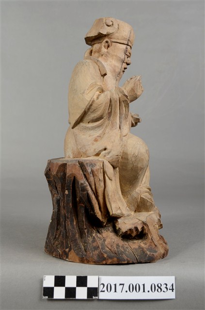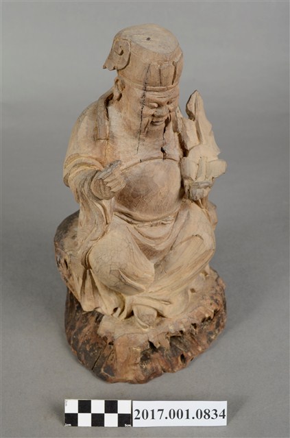 1.本件福德正神像為木雕製成,表面粧佛已除去,造型典雅。福德正神臉型方正,頭戴東坡巾,嘴巴大張嶄露笑容,神情開懷,福德正神身穿長袍,沒有彩繪安金等施作,左胸處有一道蟲蛀裂縫,左手持物品,看似玉版或如意。右手抬起似有握物,應是拐杖遺失,足部呈現安字形交叉,左足藏於右足之後,坐於岩座上。