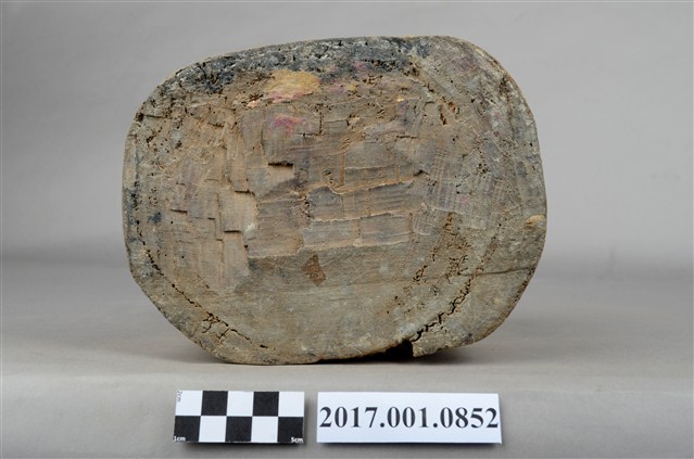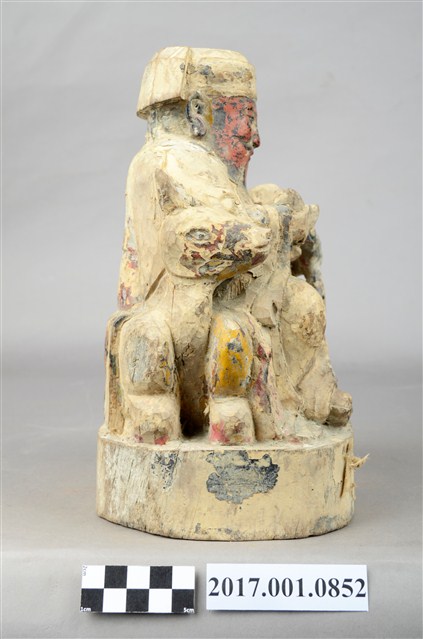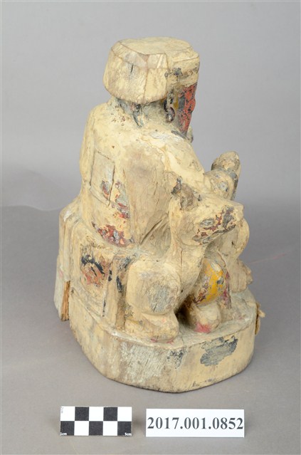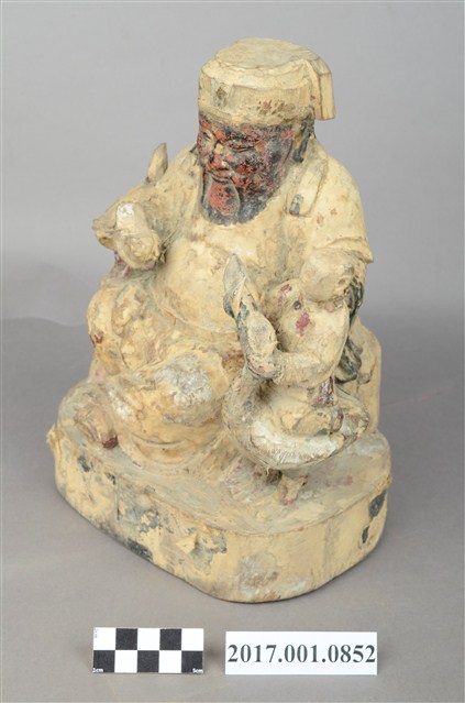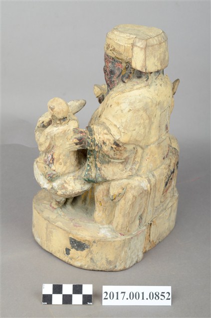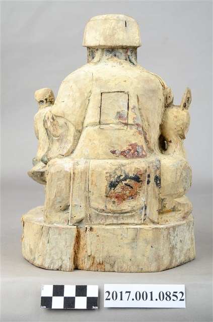 1.本件福德正神神像為木雕製成,附有一名童子與仙鶴、鹿。福德正神姿態悠閒從容,端坐於仙鹿的背上,仙鹿頭上無角,從福德正神右側探頭出來。福德正神頭戴員外巾,臉色通紅,面帶微笑,神貌慈祥。福德正神身穿長袍,外部色彩已經剝落,只餘下白色底層,右手持元寶,左手則輕撫左側童子,童子頭髮結髻,臉孔秀氣,騎在仙鶴身上。仙鶴頭部稍有破損,其頭部伸向福德正神,姿態生動。福德正神雙腿交叉呈現安字形,左腳在前露出穿雲頭履的足部。本件福德正神同時雕有童子、仙鶴、仙鹿等配角,表現出多子、高壽、進祿等吉祥含意。