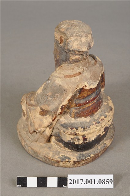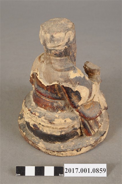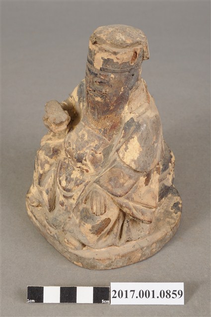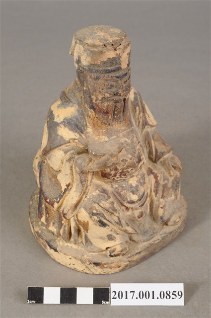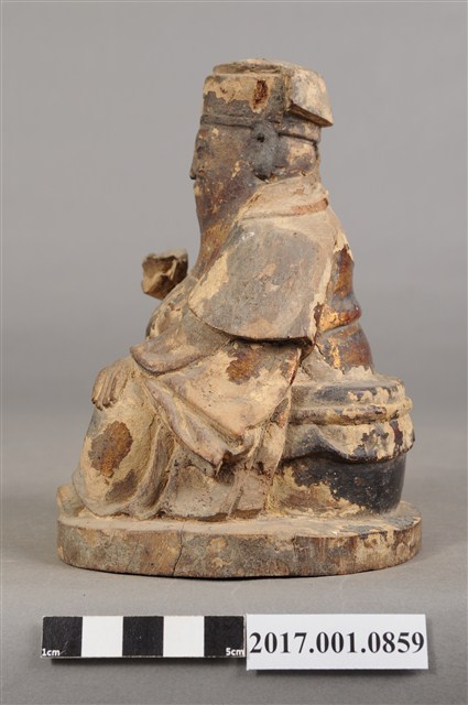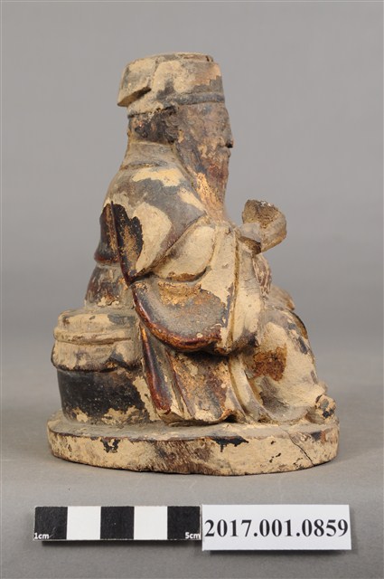 1.本件福德正神為木雕製作,表面安金與紋飾已經剝落無法看出原貌,體積小巧,雕刻線條優美,體態優雅。福德正神頭戴東坡巾,方臉大耳,面露微笑,表情和藹可親。福德正神身穿長袍,右手持元寶,左手按於左膝之上,長袍的衣褶處理自然線條優美,作工精巧。福德正神背部一部分安金層並未脫落可以看出原本色彩。