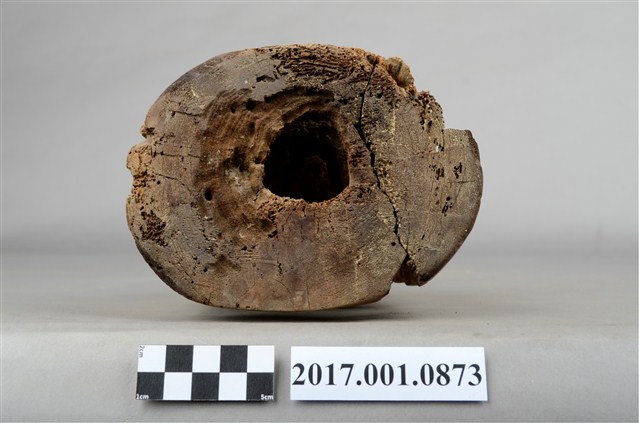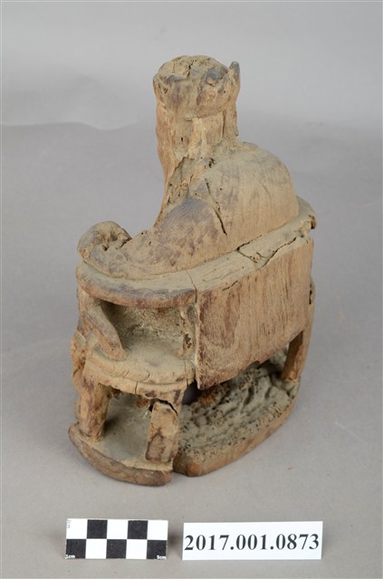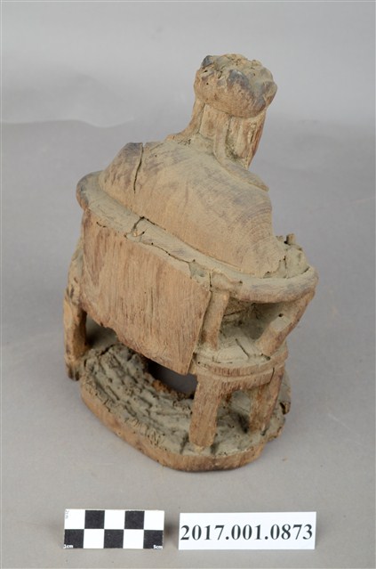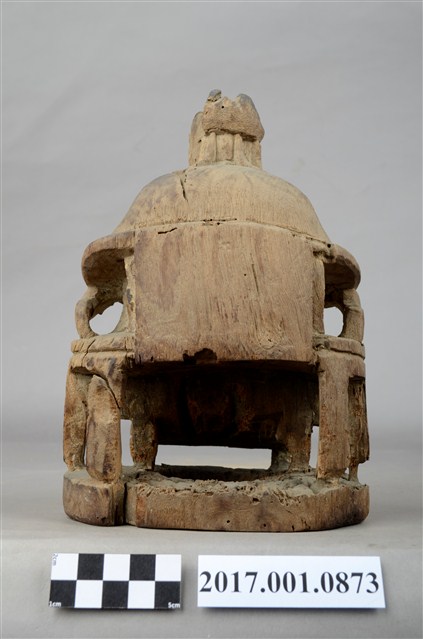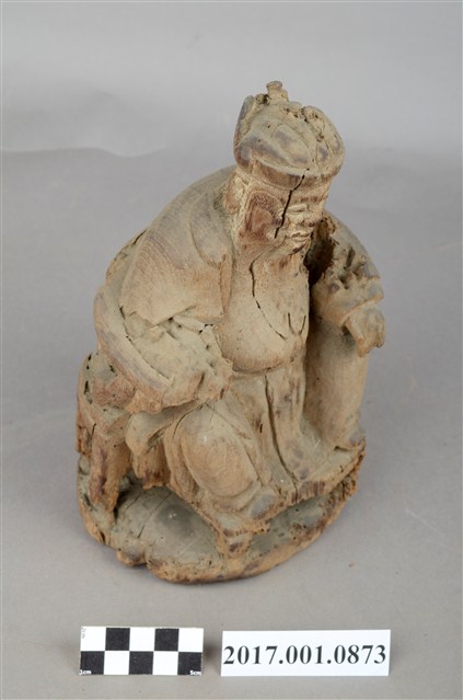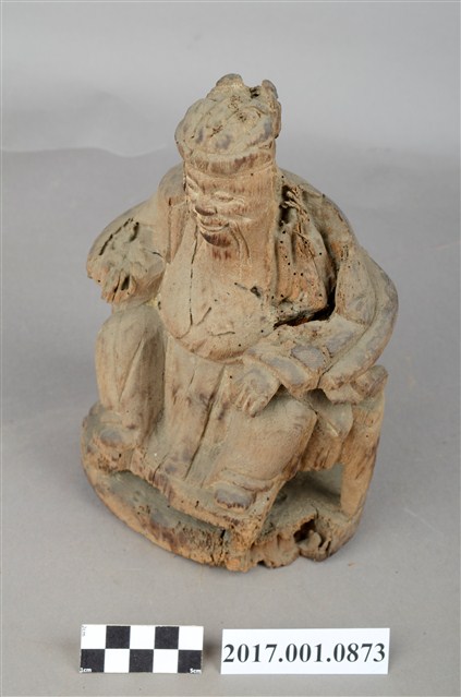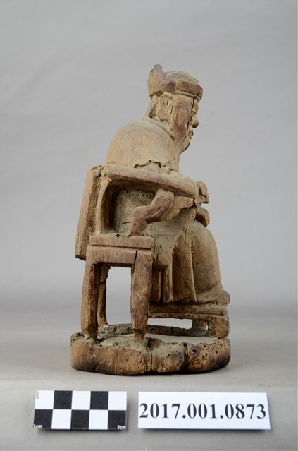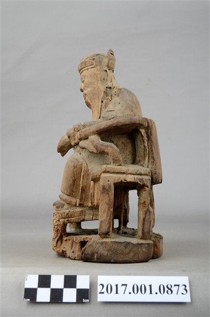 1.本件福德正神像以木雕製成,造型古樸,表面之粧佛已除去,神像受到蟲蛀多處破損。福德正神頭戴忠靖冠,鼻頭高起,笑容滿面,表情和藹可親,蓄有長髯。福德正神身穿長袍,端坐於圈背椅,雙足踏於踏几之上,長袍上紋飾已經不可辨識,福德正神右手持物,物件已經風化看不出具體形狀,左手扶靠扶手。福德正神左肩部分受到蟲蛀而有破損,腹部有蟲蛀痕跡,臺座也被蟲蛀出一大洞。