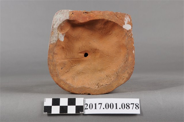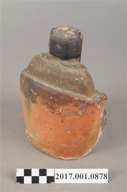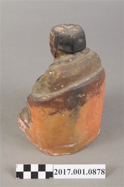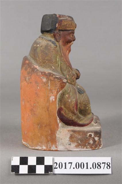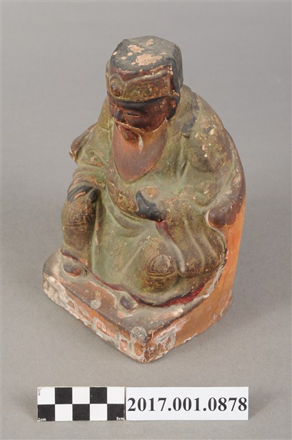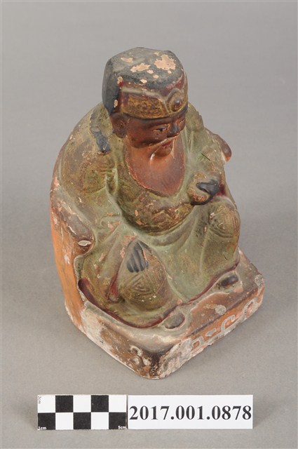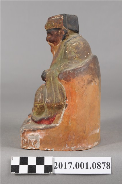 1.本件福德正神像為磚燒,表面彩繪而成。造型質樸。福德正神頭戴忠靖冠,五官以彩繪呈現,臉色赭紅,蓄有白色鬍鬚,面容和藹可親。福德正神身穿綠色壽字長袍,雙肩、雙膝都有壽字裝飾,因佈滿污漬而不甚清楚,左手持元寶,右手按於右膝,端坐於紅色圈背椅上,神袍衣褶流暢,臺座繪有紋飾。