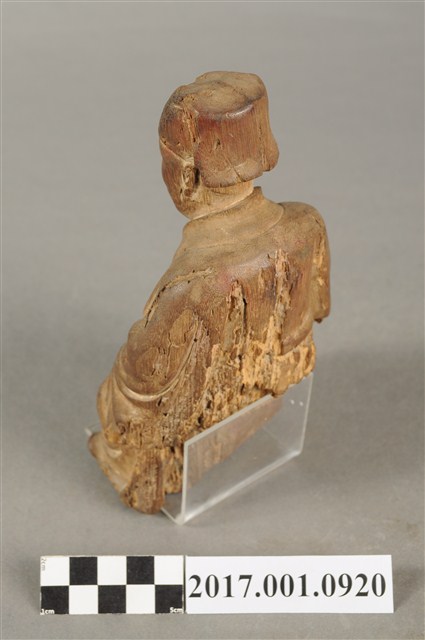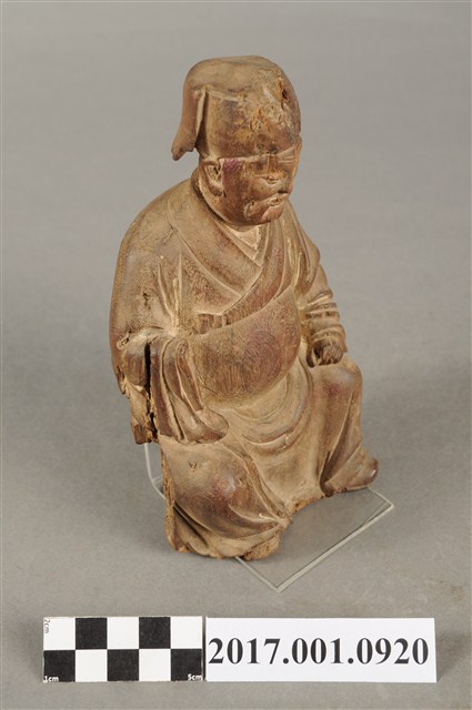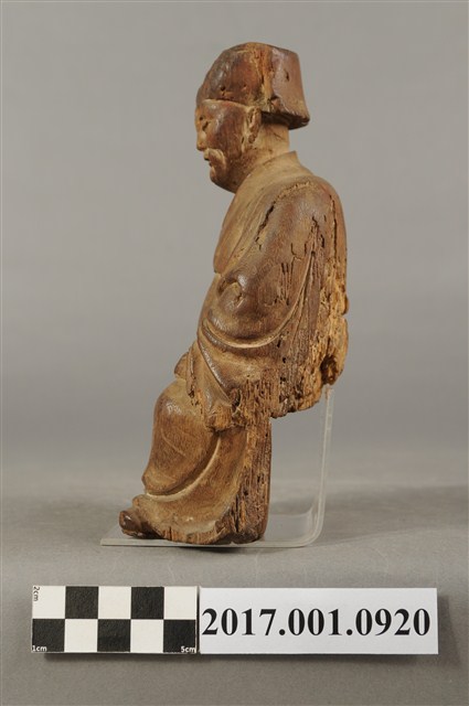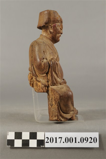 1.本件福德正神像為木雕製成,福德正神頭戴東坡巾,圓臉大耳,臉頰豐滿,慈眉善目,蓄有長髯,福德正神採脫椅技法雕刻,神像與臺座分開。福德正神身穿長袍,表面粧佛已除去,衣褶線條自然流動,右手掌斷裂不知所持何物,左手擺放於左膝上。