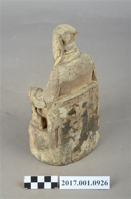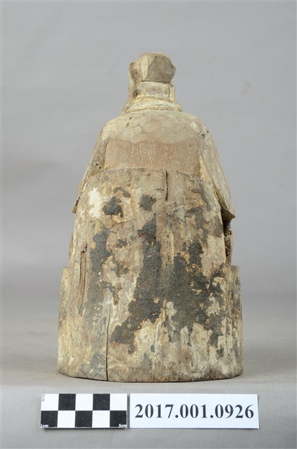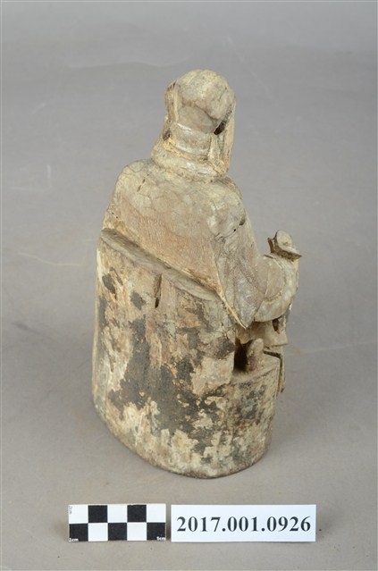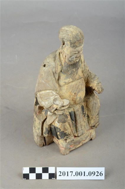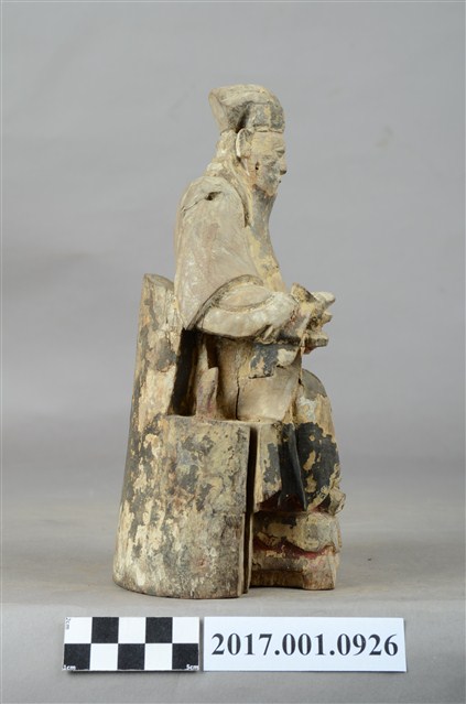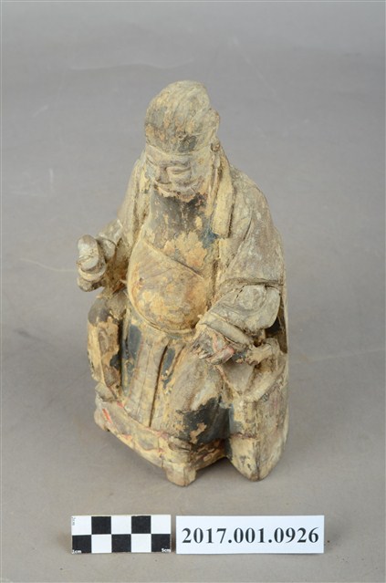 1.本件福德正神像為木雕製成,表面安金彩繪層粧佛已除去。福德正神頭戴忠靖冠,五官立體,蓄長髯,鼻頭高凸,雙目垂視,面帶微笑,神情和藹可親。福德正神身穿長袍,呈貴字體姿態,端坐於圈背椅之上。長袍無額外線條裝飾,右手持元寶,左手倚靠於座椅扶手,雙足踏於踏几之上。