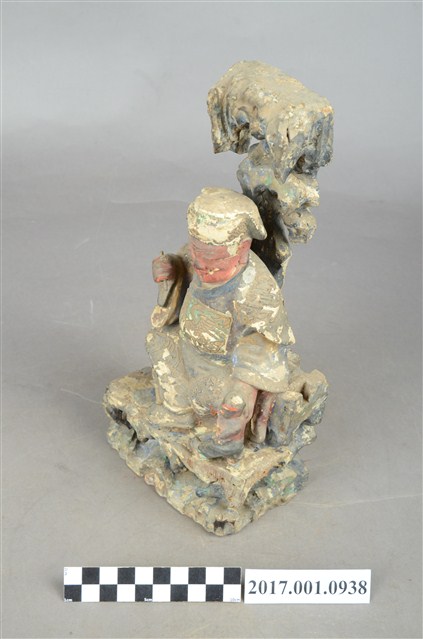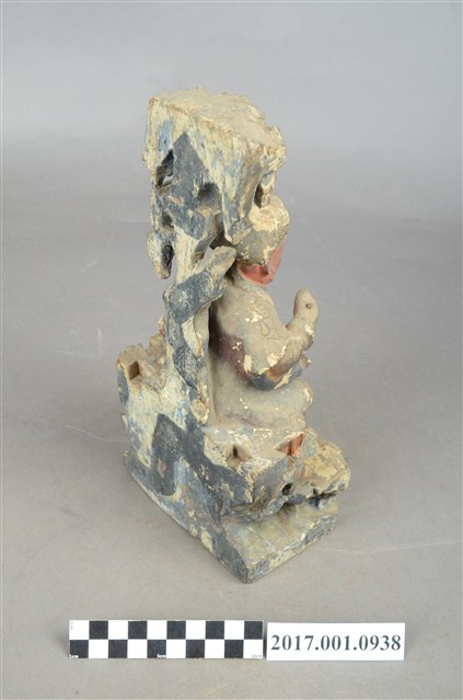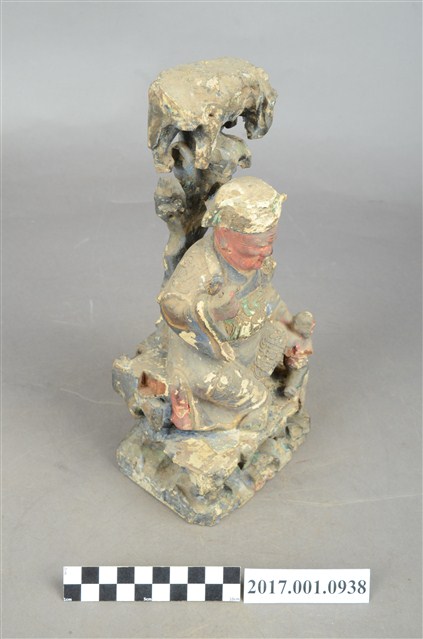 1.本件福德正神與童子像為木雕並施以彩繪粉雕等粧佛工法,造型華麗。福德正神頭戴巾,臉色紅潤,鼻頭高起,植鬚已經掉落,臉部雙頰有肉,雙目垂視,面帶微笑,神情安詳。福德正神採安字體坐姿,身穿佛青色仙鶴長袍,端坐於岩座之上,腹部以漆線雕仙鶴圖案,雙肩與雙膝處則飾有雙喜字樣。福德正神左手扶著一名童子,右手持舉拐杖,拐杖已經遺失。童子身穿布衣,臉部因風化緣故已不甚清楚,其左腳向前步出,為走動的姿態,右腳直立,雙手斷裂不知手持何物,整體姿態生動,表情神氣。福德正神背後有雕有奇石形狀的靠山,型式少見。