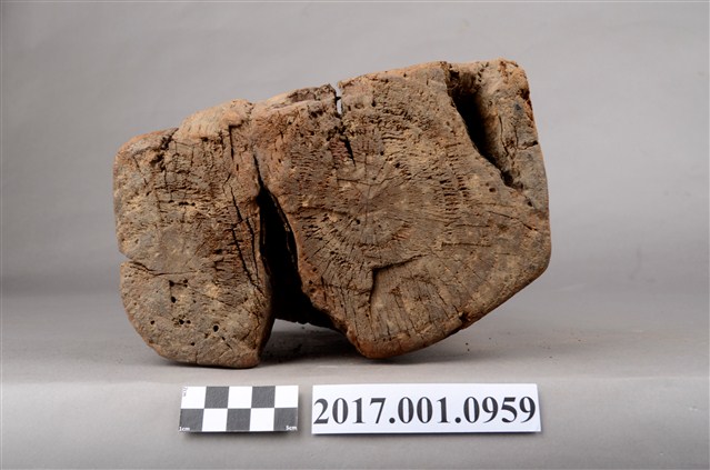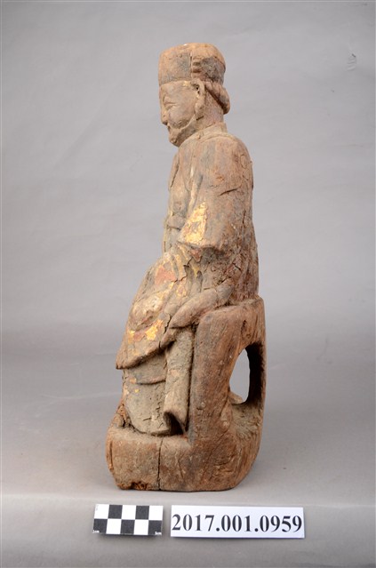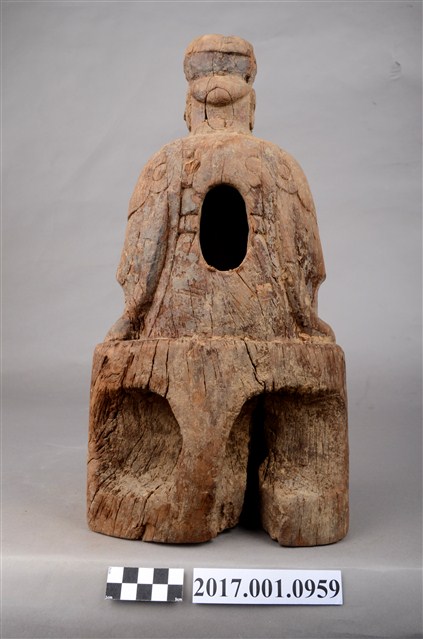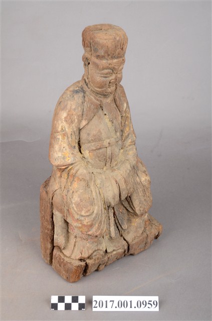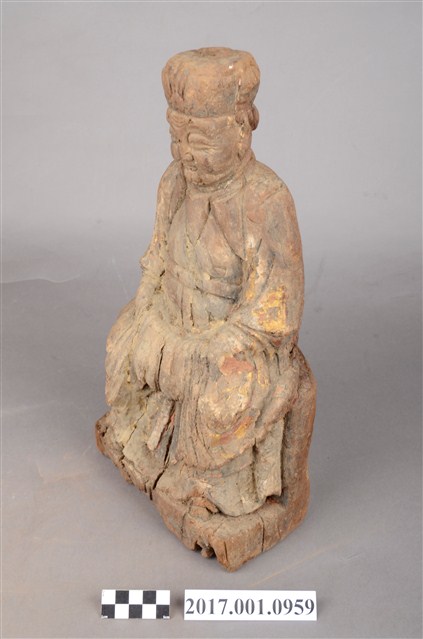 1.本件木雕福德正神夫人像採坐姿,坐於臺座上,表面粧佛已褪去,上額、山根處有蛀蝕孔,正面袍服下襬數道縱裂紋,臺座蛀蝕,後腦及背後各開有一個橢圓形入神洞,後腦入神洞封榫尚存,背後入神洞的物件已取出。福德正神夫人作老年婦女相貌,瞇眼,上額三道抬頭紋,雙頰法令紋深邃,頭戴大圓巾,後腦垂有髮髻。身著寬袖袍服、竹葉形雲肩,胸下束腰帶,下端垂於袍服下襬前,雙手合抱於腹前,手掌隱於衣袖之內,雙足平踏於臺座上。
