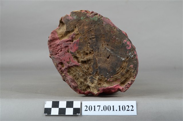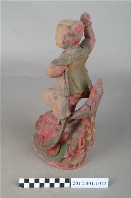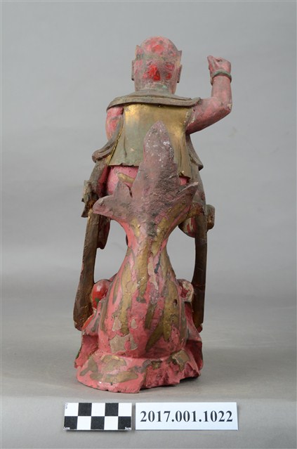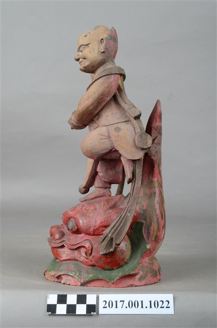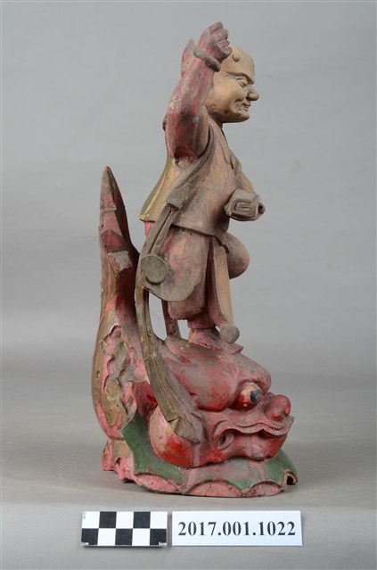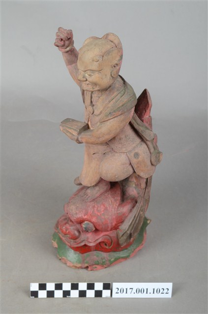 1.本件木雕魁星像,作立姿姿態,表面施作塗裝粧佛技法,魁星粧佛去除,鰲魚露出朱紅漆面。魁星呈現精怪造形,頭頂隆起,耳旁鬢髮朝天,眉骨凸出,雙眼圓睜,嘴露獠牙。身著開襟罩衫,右手佩戴手釧,披飄帶,飄帶下端自兩脅垂至鰲魚,下半身著長褲,褲外圍甲裙,腰繫布帶,跣足。左手曲臂捧書冊於胸前,右手握拳高舉。右腳站立於鰲魚頭上,喻為獨占鰲頭,左腳向後踢。鰲魚頭部朝前,尾鰭翹起。