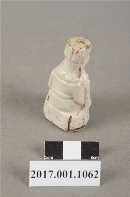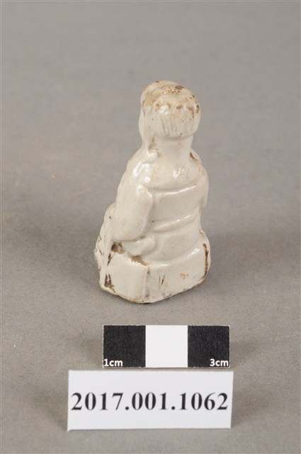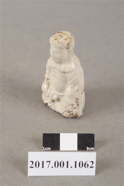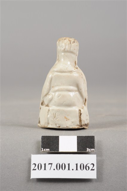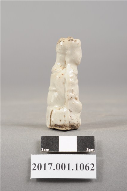 1.本件陶燒廣澤尊王像,作坐姿姿態,尺寸微小,表面施白色釉。臉型輪廓豐潤,五官略顯模糊。頭戴幞頭,身作「衷甲」式的裝束,身著鎧甲,外套著窄袖蟒袍,在衣領處露出鎧甲,肚腹圓凸,腹下束腰帶,胸前有看帶,腳穿皂靴。挺身端坐,左手置於腿上,右手握著腰帶。左腳自然垂下,右腳翹起,作單腳盤坐姿態,底端開有小洞,內部挖空。