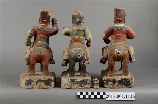 1.本組騎虎尊王像為木雕,皆作騎虎姿態,跨坐於虎背上,表面施以粉雕、彩繪與安金製成。三尊神像左右兩尊為中年蓄鬚男子造形,中央一尊為無鬚臉型粗獷造形,三尊姿態造形各異,中央尊王舉左手,右側尊王舉右手,左側尊王雙手下垂外張。座下之虎皆作四肢直立,頭部朝前方