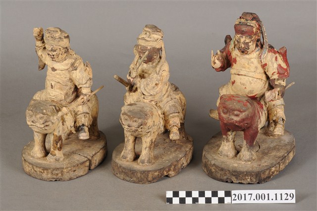 1.本組為木雕劉先主、關聖帝君、張桓侯像成組配對,表面粧佛已褪去,背面開有長方形入神洞,其中劉先主神像的封榫尚在、關聖帝君神像的入神物已取出、張桓侯神像的封榫已不存,可見到入神物。三尊皆作騎虎姿態,身著鎧甲,作武將裝束,神像的表現罕見雕塑劉備、關羽、張飛的坐騎為虎,若單就騎虎作為判斷會是騎虎王爺等神,然而這三尊手持兵器符合《三國演義》描述劉備手持雙股劍、關羽手持青龍偃月刀、張飛手持丈八蛇矛,因而判斷為劉備、關羽、張飛。