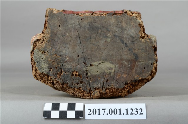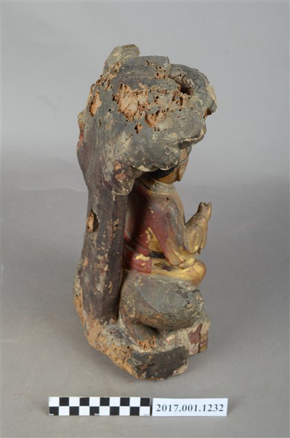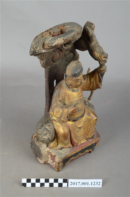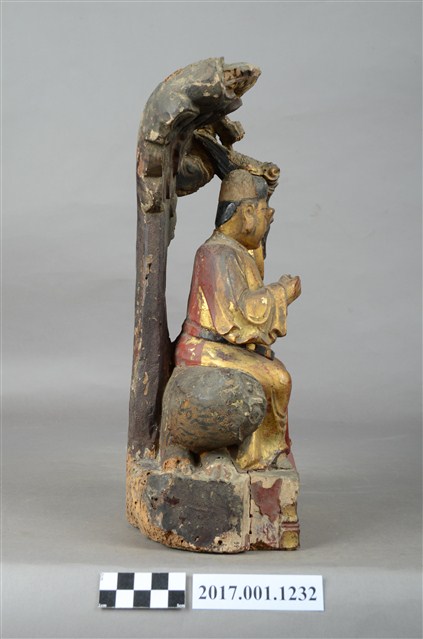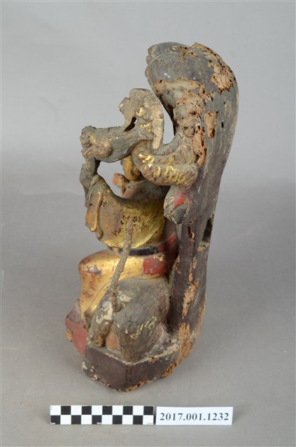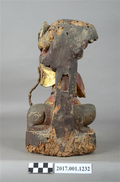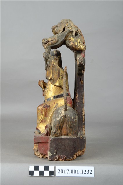 1.本件木雕藥王像,作坐虎姿態,神像身後有延伸至頭頂之祥雲,表面施作塗裝、安金不見紅粧佛技法,背面開有長方形入神洞,封榫佚失,內容物件已取出。臉型輪廓橢圓,頭部微轉向左,雙眼半睜,顏面以墨線彩繪鬍鬚。頭戴幞頭,身著窄袖盤領衣,肚腹處錦雕鶴紋補子,腰束腰帶,腳穿皂靴,坐於虎背上。挺身端坐,左手向上高舉握龍鬚,右手小臂上舉持物,物件斷裂僅存握柄,雙足平踩於踏几上。藥王身後左上方的雲中凸出龍頭,虎呈趴伏狀,龍與虎呼應藥王醫龍眼、治虎喉的傳說典故。