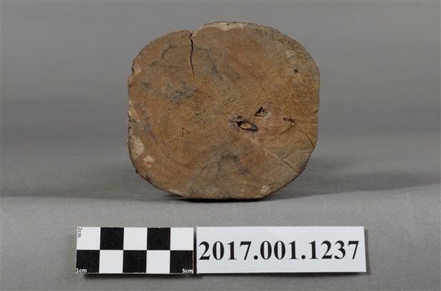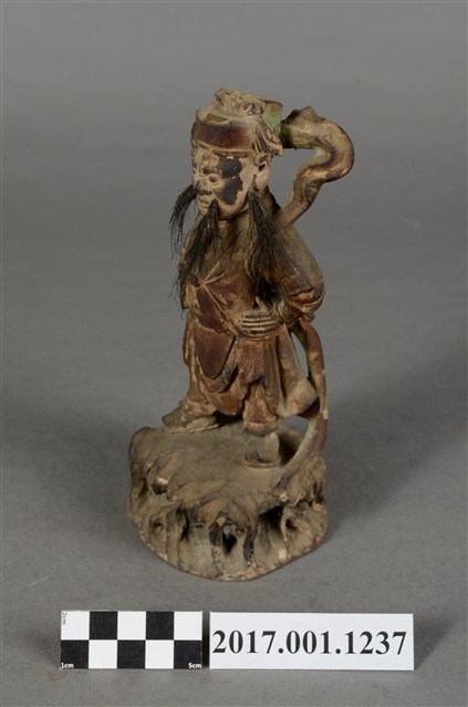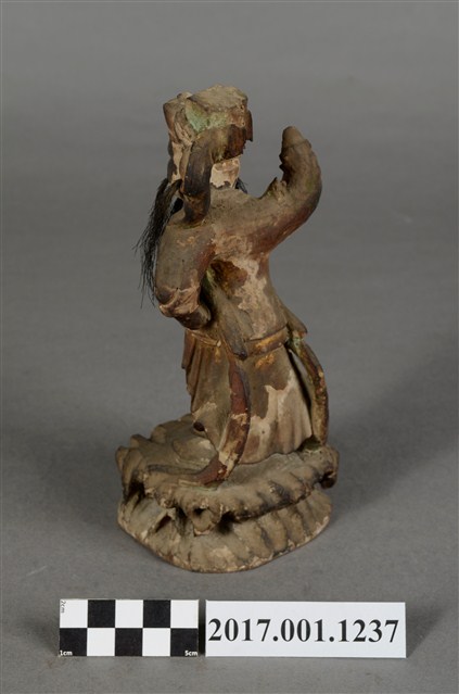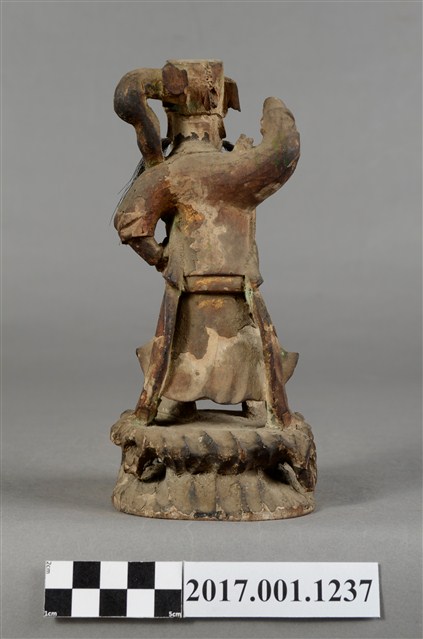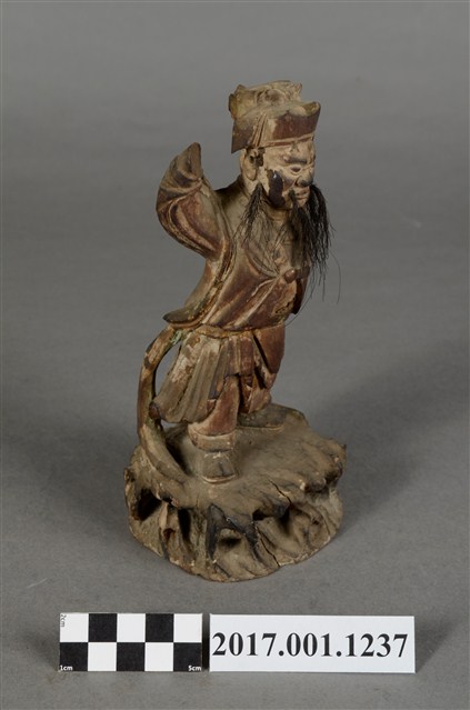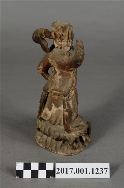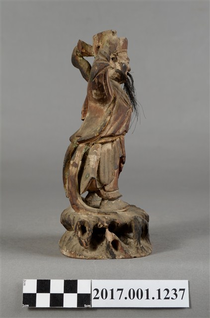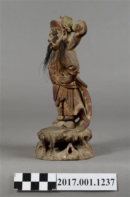 1.本件木雕護法官將像採立姿,粧佛大部分除去。官將面蓄五柳長髯,雙目瞠視,鼻頭凸出,表情威嚴。頭戴幞頭,肩披飄帶,右側部分斷裂,身體內穿長袍、甲裙,外罩對襟短衫,腳穿皂靴。左手插於腰部,右臂高舉,手臂部分斷裂遺失。右腳前伸,左腳在後,作丁字步姿態,踏於臺座上,臺座作高方岩座。