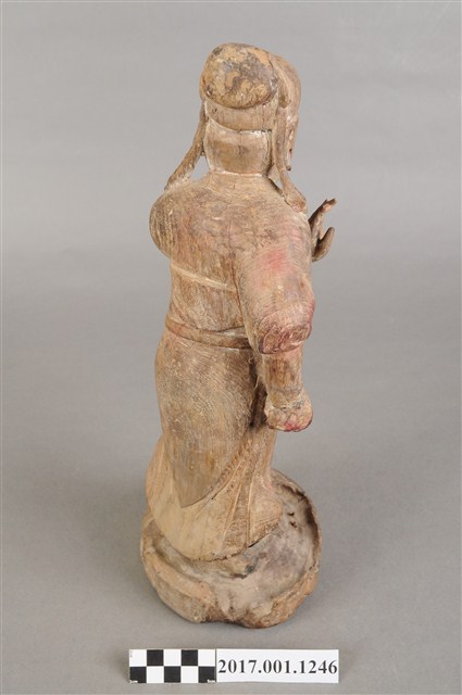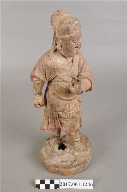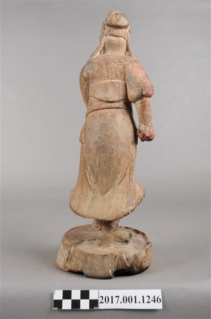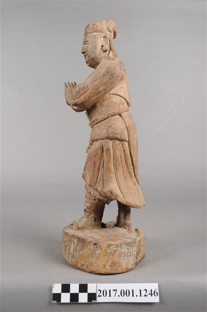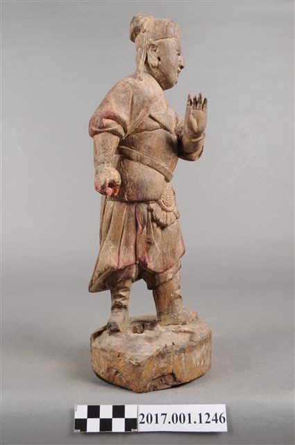 1.本件木雕護法官將像作立姿,粧佛大部分除去。將軍嘴邊有植鬚孔,皺眉,雙目瞠視,雙頰豐腴,鼻頭凸出。將軍頭戴頭巾,身穿甲袍,足穿皂靴。左手掌併攏橫伸於腹前,右手握拳置於腰際,左腳向前跨出,右腳在後腳掌朝右,作丁字步姿態。臺座作矮圓臺。臺座中間有洞。