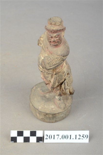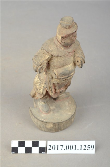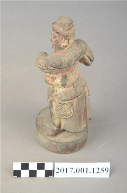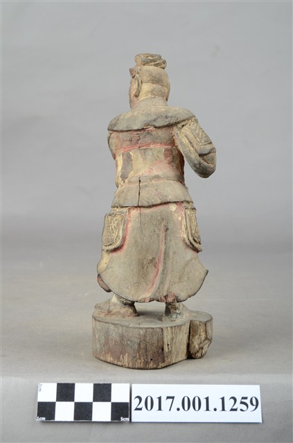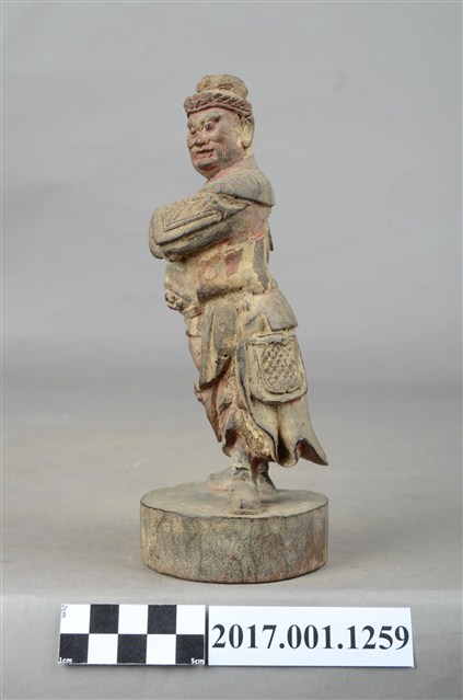 1.本件木雕護法官將像,作立姿姿態,表面粧佛褪去。頭部側向左,瞠目,皺眉,顴骨與顎骨凸出,法令紋深邃,表現憤怒的相貌。頭戴兜鍪,鍪後為頭巾,上半身著盤領衣、下半身著長褲,肩頸披著布巾與披膊,腹肚圓凸,腰束腰帶,護腹以腰帶固定,正面的腰帶下有左右擋,護肩與左右擋以錦雕表現鎧甲紋飾以,雙腳穿皂靴。立像挺身以雙足丁字步的姿態站於臺座上,左手右伸,右手向下,雙手的小手臂斷裂缺損。臺座平面近似圓形,側邊損毀缺損。