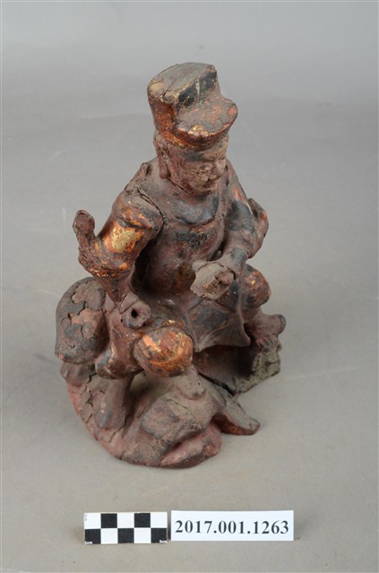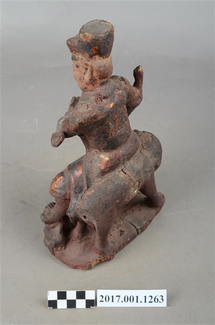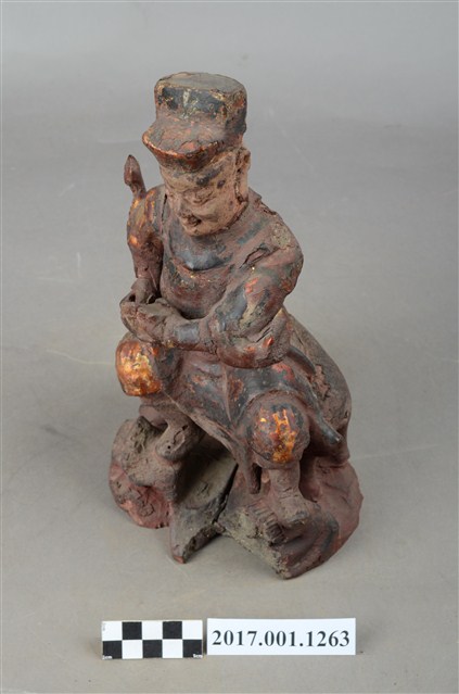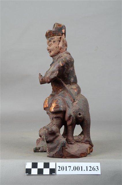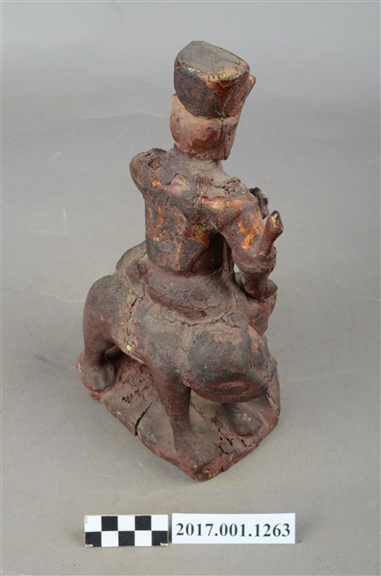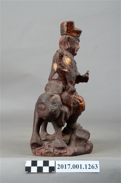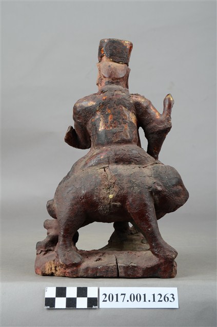 1.本件木雕護法官將像採坐姿,坐於老虎背上,粧佛大部分除去。官將作中年男子相貌,無鬚,濃眉大眼,雙目瞠視,長耳,鼻頭顴骨凸起。頭戴幞頭身穿甲袍,腳穿皂靴,左手橫伸於胸前,手掌朝上作托物狀,右手虛拳置於右膝上,持物佚失。左腳向左伸出,右腳內縮,以足尖支地,雙腳踏於岩座上。老虎顏面模糊不清,身體中段有一道裂縫。臺座作不規則形狀。