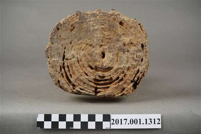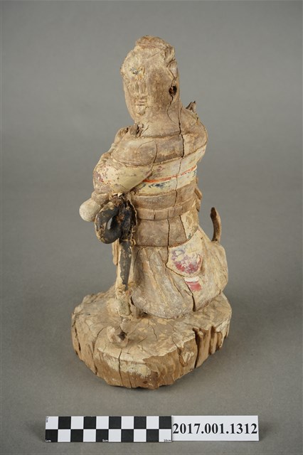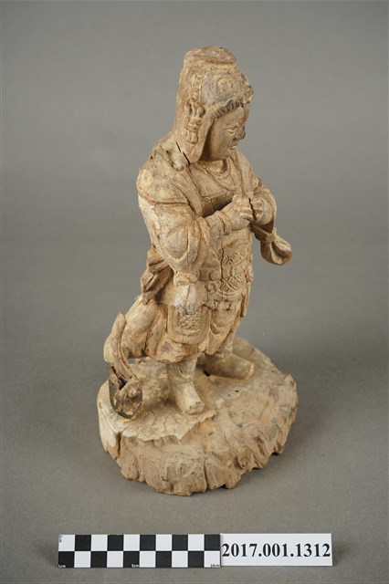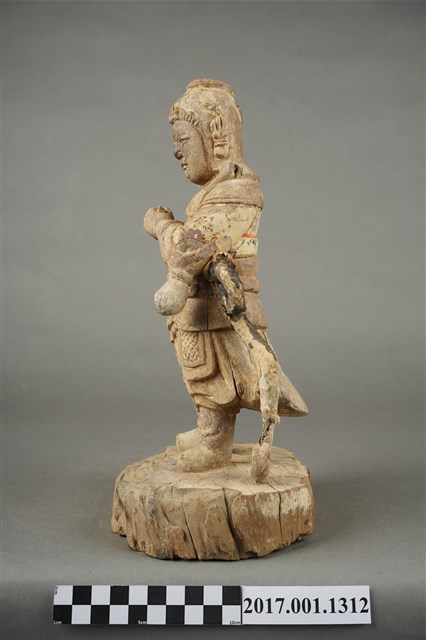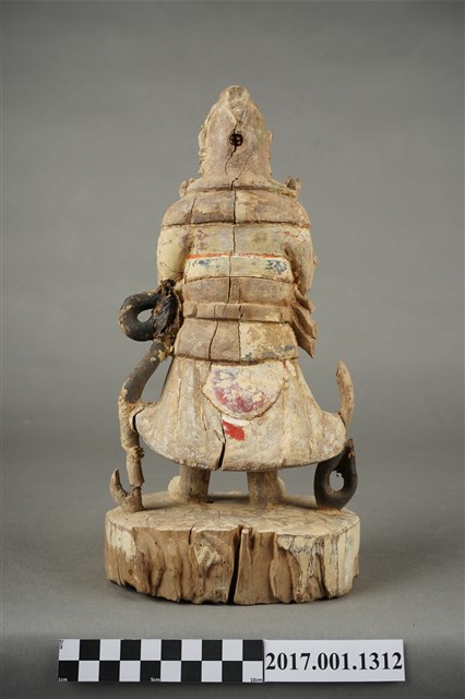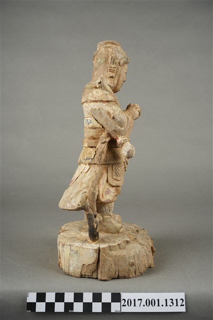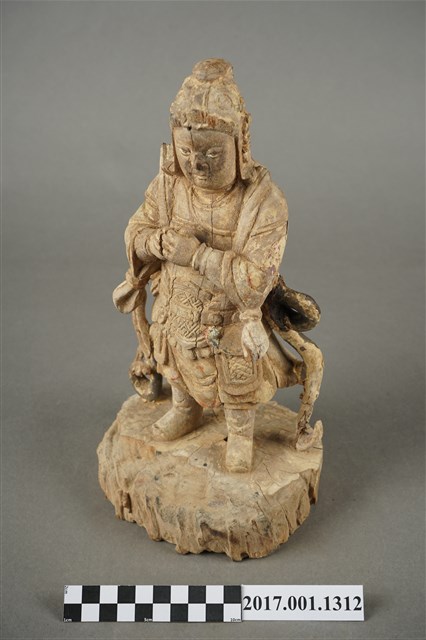1.本件木雕韋馱尊者像,表面施作塗裝粧佛技法,漆面剝落嚴重。頭部微側向左方,顏面表現青年相貌,雙目張眼,頭戴盔,身著鎧甲,披飄帶,腳穿皂靴。立像挺身站於岩座上,雙手合十置於胸前,推測是要表現合掌捧杵。