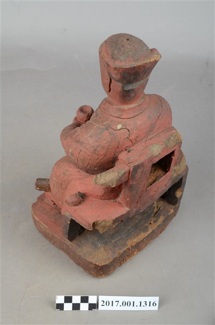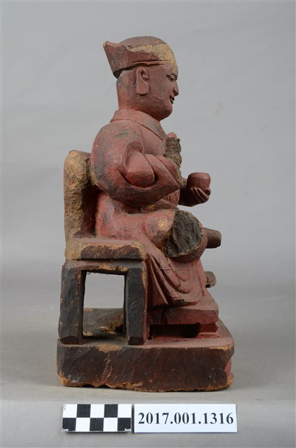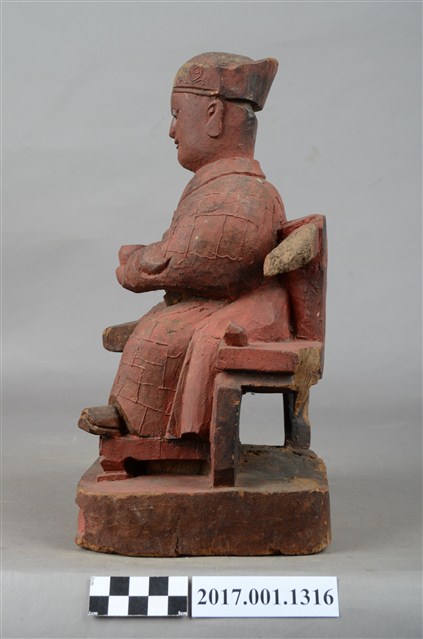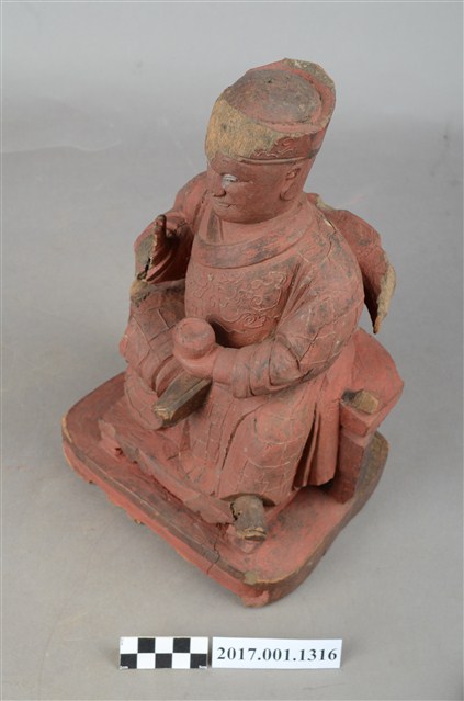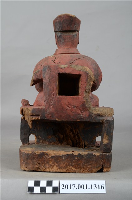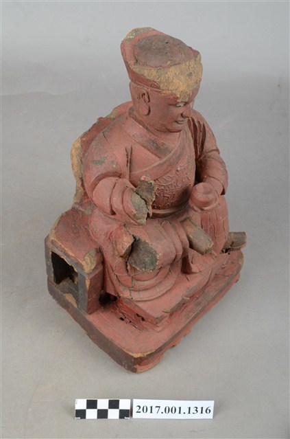 1.本件木雕祖師像,採坐姿姿態,坐於圈背椅上,表面施作塗裝、粉雕粧佛技法,背部開有方形入神洞,封榫佚失,內容物件已取出。顏面表現狀年比丘相貌,雙目張眼,面帶微笑。頭戴冠,身著右衽窄袖僧袍,上半身粉雕雲紋,袍服遍身粉雕方格福田紋,雙腳套履。挺身端坐,左足垂下,右足屈膝盤坐,膝蓋處損毀,左手托缽橫伸向右,右手掌損毀。圈背椅的扶手出頭斷裂,左後足斷裂,椅前有踏几。臺座底部蛀蝕。本件判斷為佛教僧侶,在於手勢持物為缽,袍服表現袈裟的福田紋。