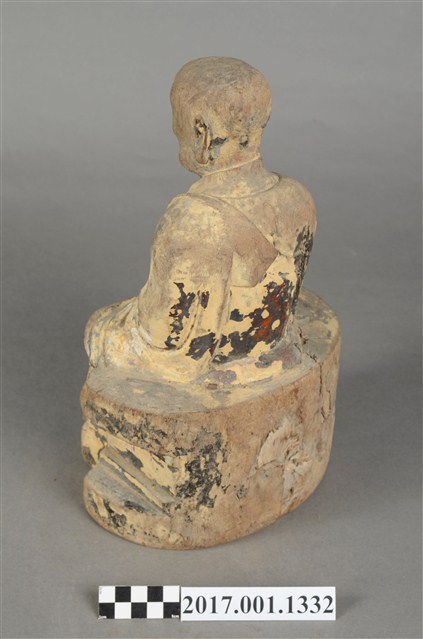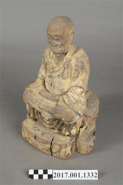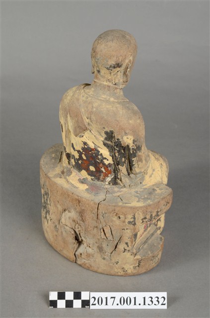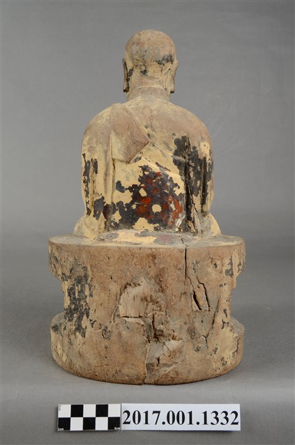 1.本件木雕清水祖師像,作結跏趺坐姿態,表面施作平塗上彩,粧佛已剝落嚴重。顏面表現雙眼垂視,山根塌、鼻樑短,身著右衽寬袖僧袍、左肩綴有袈裟環釦。雙足盤腿,雙掌相疊成禪定印置於腹前。本件判斷為清水祖師之依據為神像頭部尚存黑漆、面容表現頰肌凸出,展現清水祖師的特徵。
