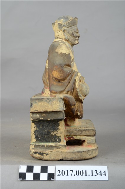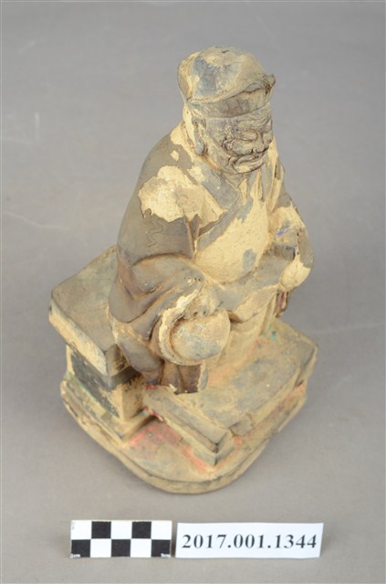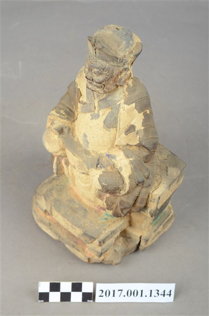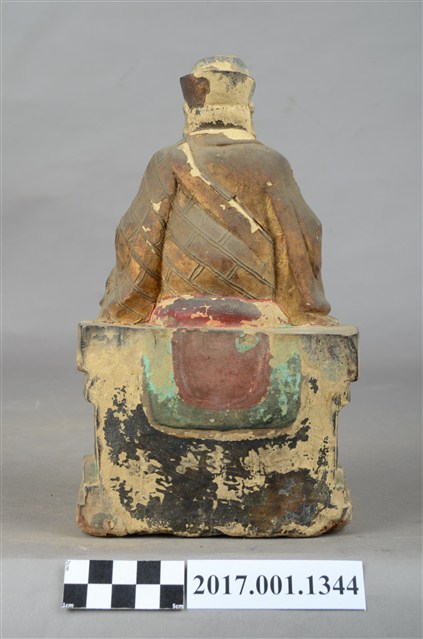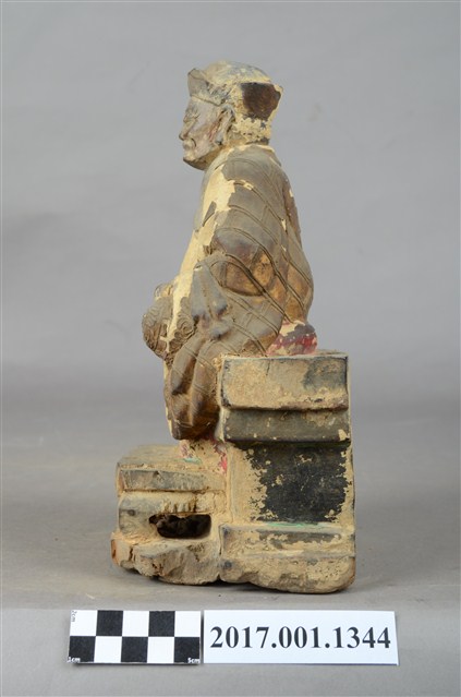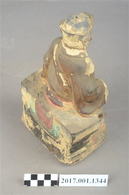 1.本件木雕清水祖師像,作結跏趺坐,坐於臺座上,表面施作裝塗、安金不見紅粉線盤飾,粧佛嚴重剝落。頭戴毘盧冠,顏面表現抬頭紋,雙眼垂視,形成老僧面容,身著右衽寬袖僧袍、左肩綴有袈裟環釦,袍服衣緣粉線盤飾寶相花紋、袍面粉線盤飾方格福田衣紋、左膝處的袍面粉線盤飾吉祥紋飾,推測為團鶴紋。雙足盤腿,雙掌因損毀而無法辨識是何印契或持物。臺座前有踏几。