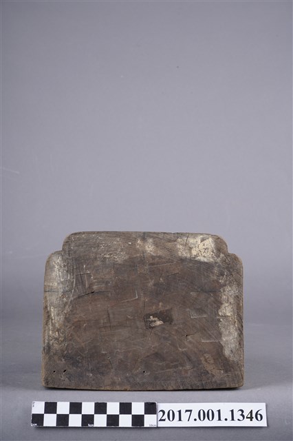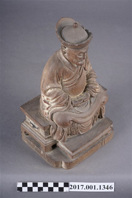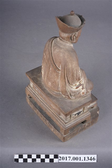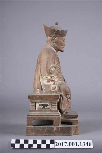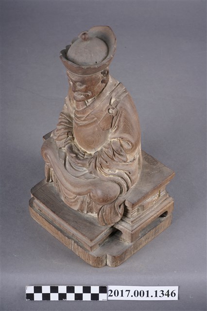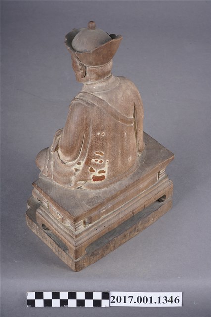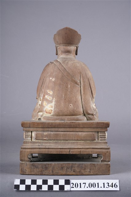 1.本件木雕清水祖師像,作結跏趺坐姿態,坐於禪床上,粧佛已褪去。頭戴毘盧冠,顏面表現抬頭紋,雙眼垂視,形成老僧面容,身著右衽寬袖僧袍、左肩綴有袈裟環釦。雙足盤腿,雙掌相疊成禪定印置於腹前。禪床前有踏几。