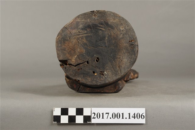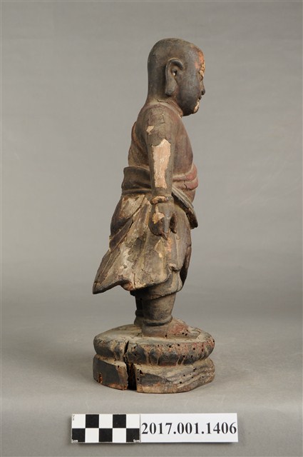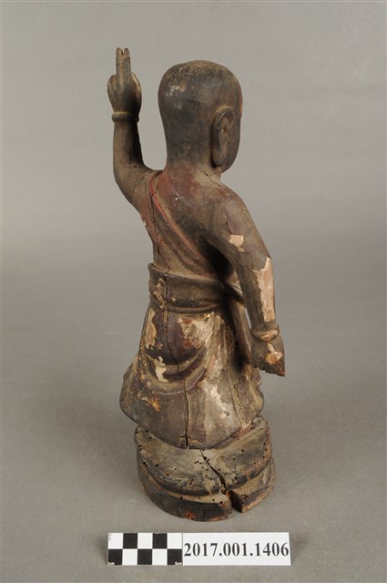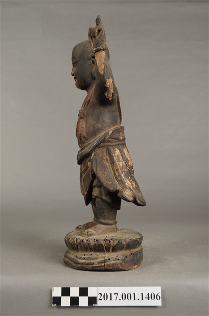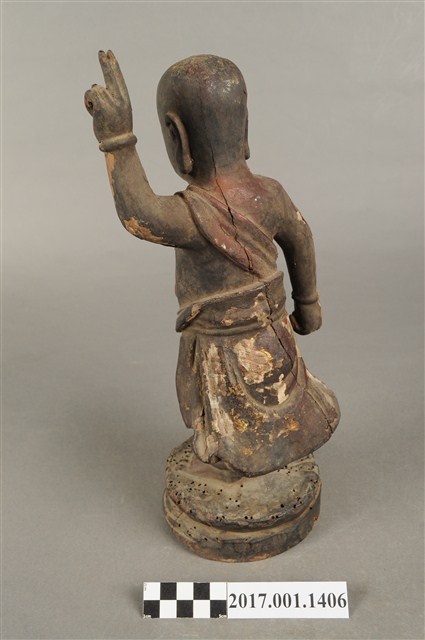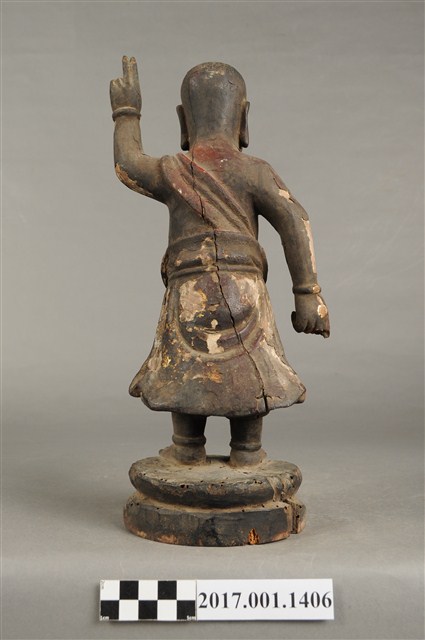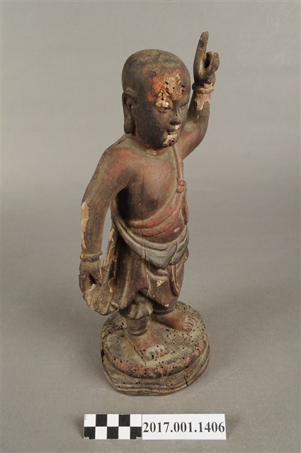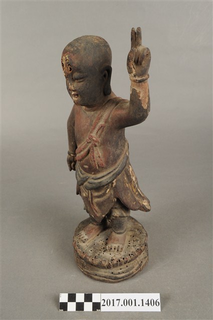 1.本件木雕釋迦牟尼佛誕生像,表面平塗黑漆,漆面大致完整。造像為表現釋迦牟尼佛誕生時的樣貌,因而呈現無髮的孩童形象,四肢分別佩戴著手釧、腳釧,雙手手指豎食指與中指收三指,左手向上、右手朝下,上半身赤裸僅繫著布帶、下半身著長褲並圍著布料,跣足站於蓮座之上。蓮座為仰蓮式。