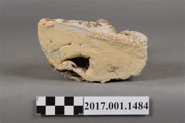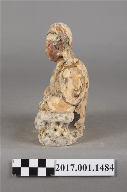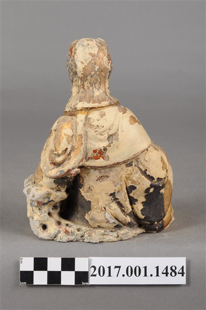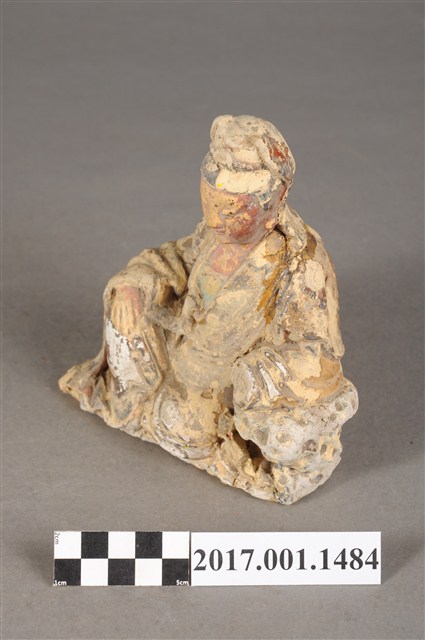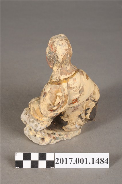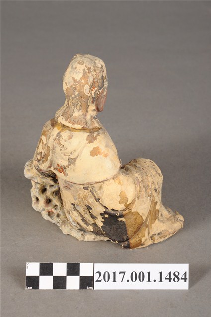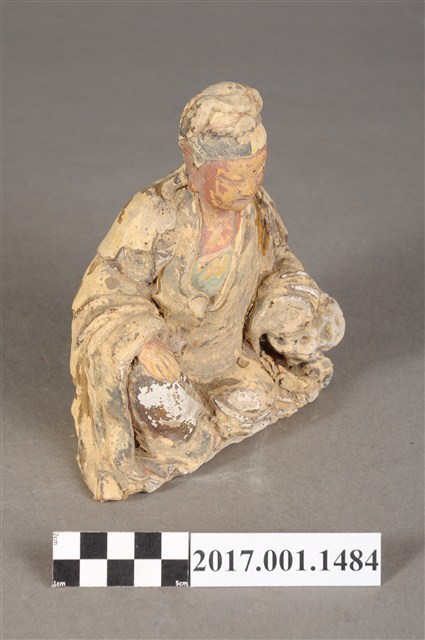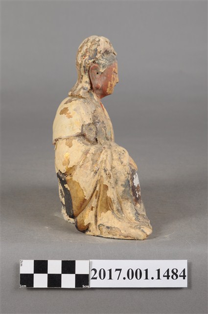 1.本件泥塑觀世音菩薩採坐姿造形,以泥塑技法為基礎製作後,在外表裱以麻布並施暗紅色漆、黃色漆、綠色漆等,神像底部未施漆,露出泥胎,臺座下端之髹漆面有破損情形。觀世音菩薩作遊戲坐姿態,跣足,左腿內彎平貼於地面上,右腿屈膝小腿微側斜立於前。右手微彎手掌輕貼於右膝上;左手手肘彎曲,憑靠於右旁的岩石上,手掌缺損。觀世音菩薩臉孔安詳莊嚴,頭披風帽,身穿軟袍披肩。