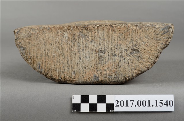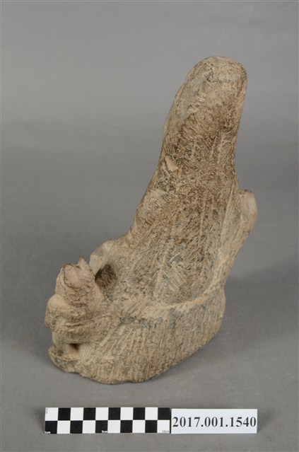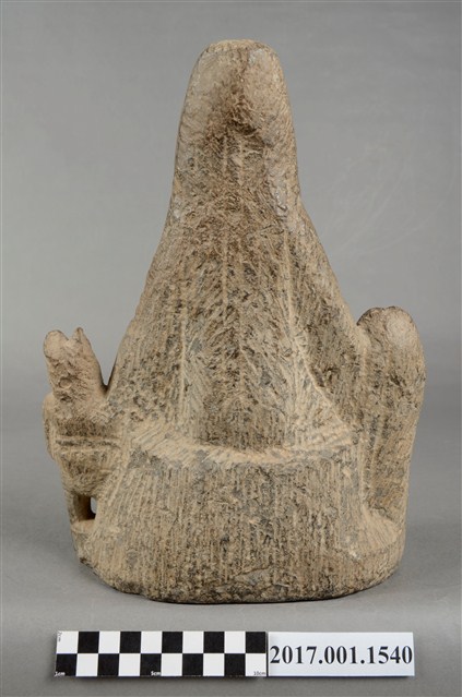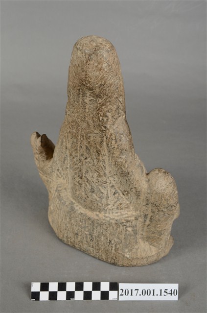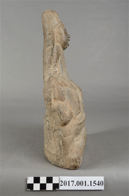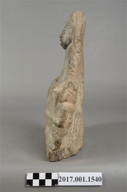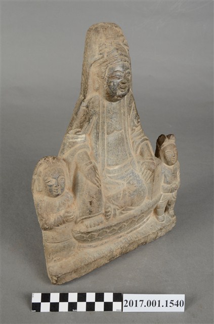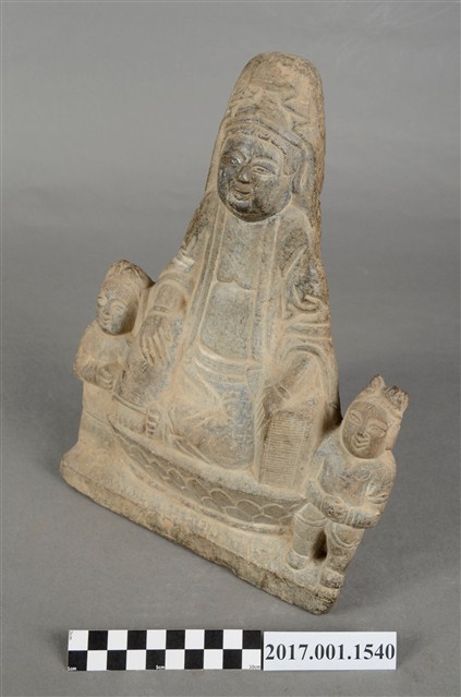1.本件石雕觀世音菩薩像作觀世音菩薩與左右脅祀善財、龍女三像相連形式,以黑色岩石雕開而成,表面佈滿黃土灰,雕工樸拙。石雕三像連中央作一尊觀世音菩薩之像,菩薩作遊戲坐姿態,頭部微上仰,臉型圓滿,頭梳圓髻、披風帽,身穿開襟袍服,袒胸,臺座作蓮花造形。跣足,左腿屈膝朝內平擱於蓮座,右腿屈膝小腿直立,右手置於右膝上,左手倚於身左之經函上。菩薩左旁立善財童子,著短衣短褲,頭梳雙髻,雙手抱拳,右旁立龍女,著短衣長裙,露出一隻抱拳右手。