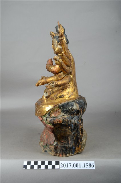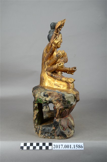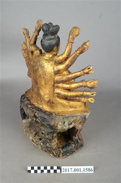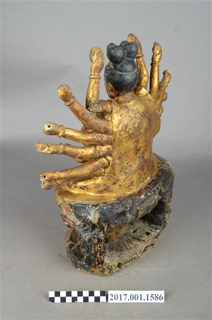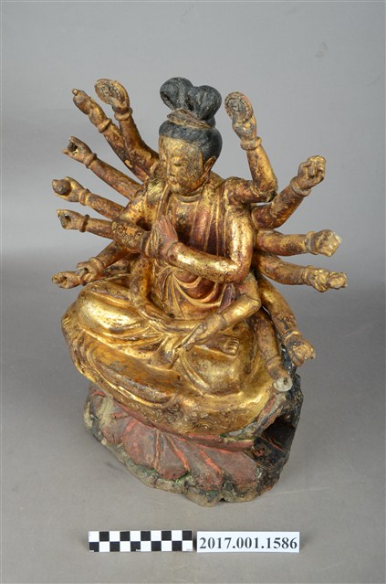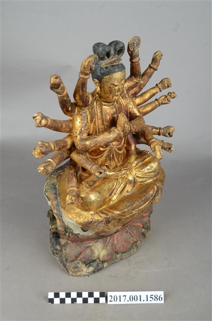 1.本件木雕觀世音菩薩像作十八手觀世音菩薩造形,身軀之安金大部分脫落,並佈有污漬。菩薩結跏趺坐於紅色蓮座上,頭梳高髻,雙眼垂視,朱唇,身穿開襟袍服,赤裸手臂,袍服下襬垂於座前。十八隻手作左右對稱,胸前一對手臂作合十狀,腹前一對手臂結禪定印,其他七對手臂自背後向外伸出,兩兩對稱分佈於身軀周圍,每隻手戴皆有手環,頭部兩側手中分持日、月牌,其他手中之持物多已遺失,蓮座作朱紅色。