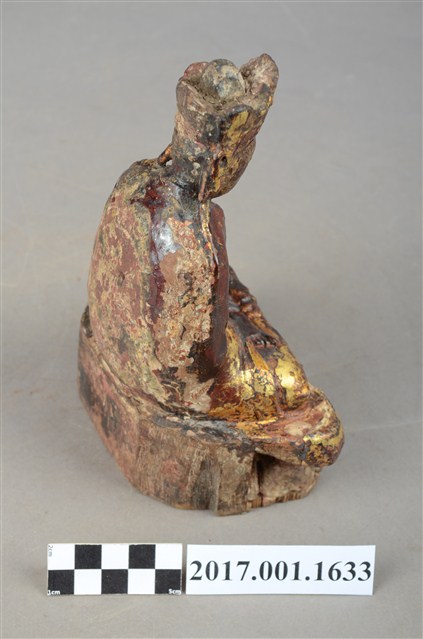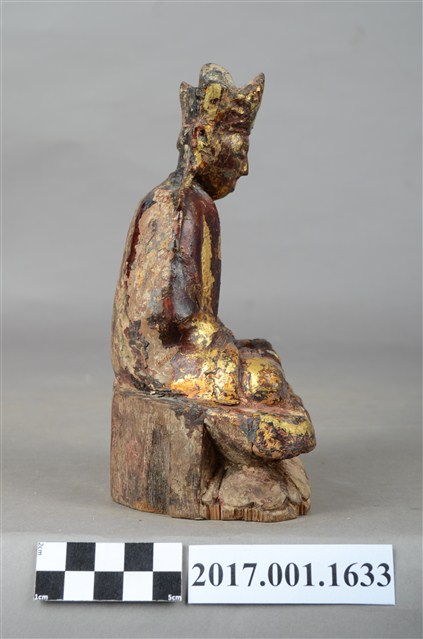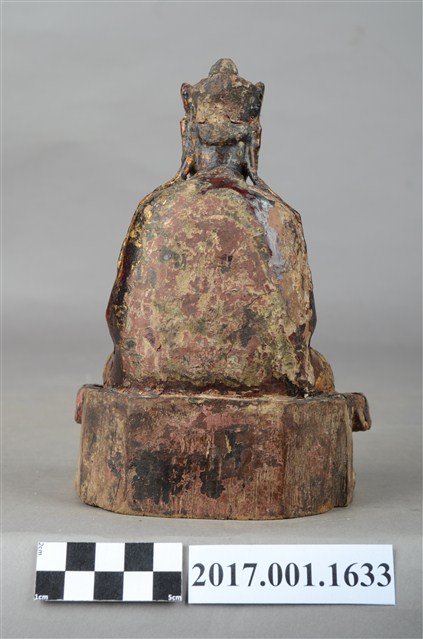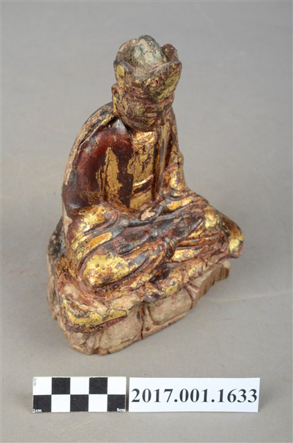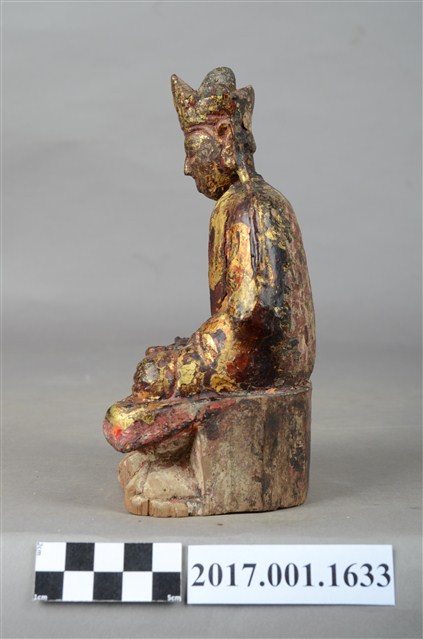 1.本件木雕觀世音菩薩像,作結跏趺坐姿態,坐於蓮座之上,表面施作安金不見紅粧佛技法,粧佛局部剝落。菩薩臉部呈橢圓形,顏面表現山根塌、鼻樑短,頭戴毘盧冠,身著開襟袍服、披肩。雙足盤腿,而右腳在上又稱為「吉祥坐」,雙掌相疊成禪定印置於腹前。蓮座為束腰仰覆蓮式。