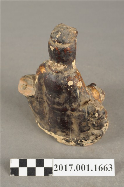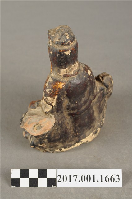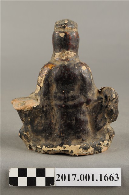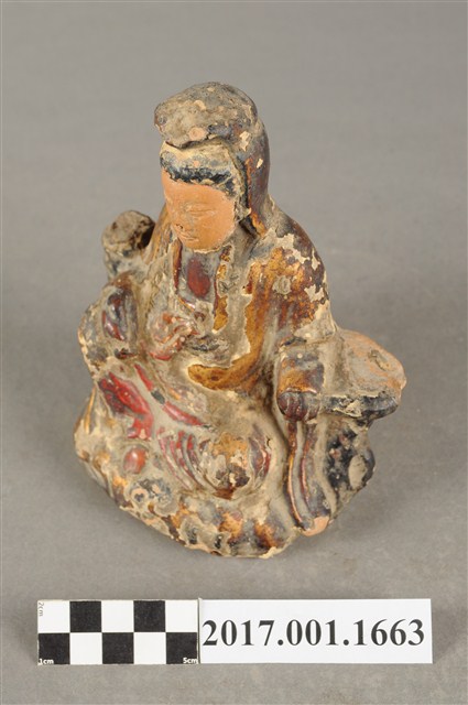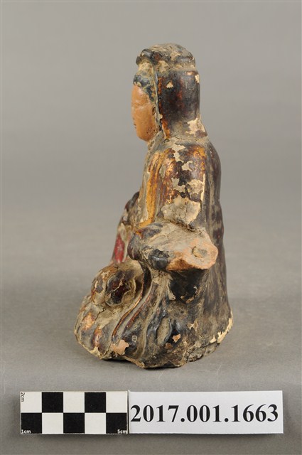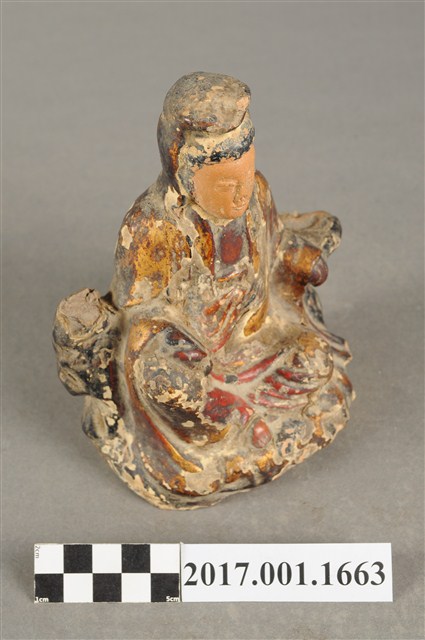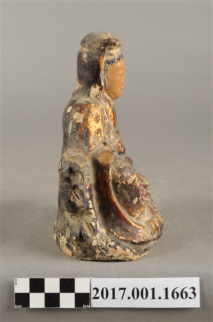 1.本件磚燒觀世音菩薩像,作自在坐姿態,坐在岩座上,作法為造模翻製再於表面施作塗裝、安金不見紅粧佛技法,粧佛局部剝落。菩薩臉部呈橢圓形,顏面表現山根塌、鼻樑短,髮梳高髻,頭披衣巾,身著開襟袍服、披肩。右腿屈膝、左腿屈膝內伸,左手依靠著岩石,左手放掌置於岩石上,右手持淨瓶置於右膝,淨瓶瓶口朝下。