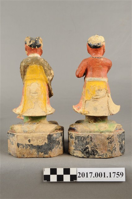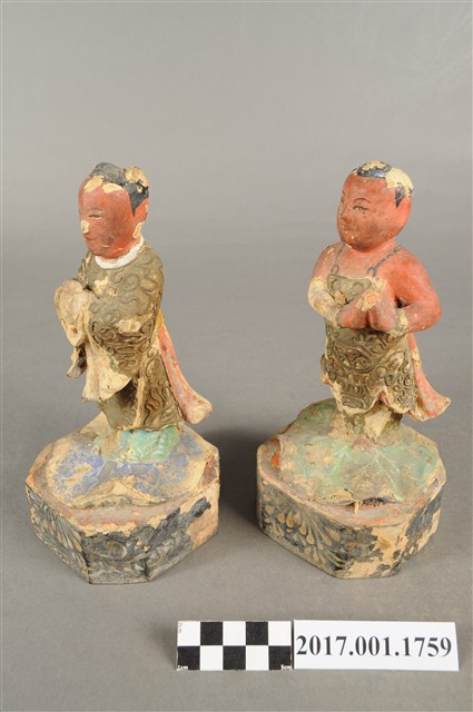 1.本組為善財與龍女兩位成組配對,為觀世音菩薩的左右脅侍,民間常俗稱「金童玉女」。皆採立姿的姿態,以木雕製作方式,粧佛局部脫落。善財童子頭頂有一撮垂髫,身穿肚兜、長褲,雙手合掌膜拜。龍女髮梳在後腦杓頸上一圈,身穿軟服,雙手合掌捧獻寶珠狀。