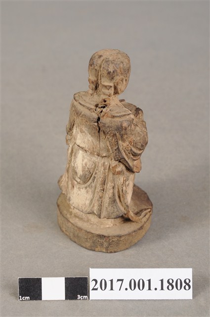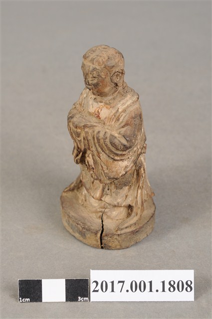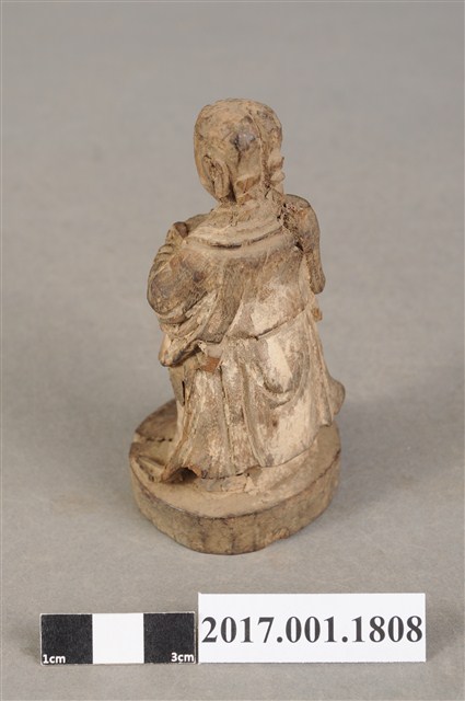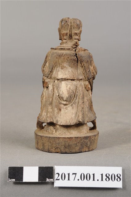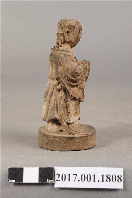 1.本件木雕龍女像作立姿,表面粧佛大面積剝落並露出底層裱紙,衣袍右肩蛀蝕破損,下方腹部有縱裂紋與蛀蝕洞,臺座左側一道縱裂紋。龍女臉型方長,長耳垂,頭部微向上仰,頭部後方垂雙髻。身著及腳背之寬袖袍服、外罩過膝裙,露出弓鞋鞋尖,腰間繫有腰帶,身後飄帶連接至臺座。雙手相接於胸前,覆一條方巾作捧珠狀,圓珠已失。