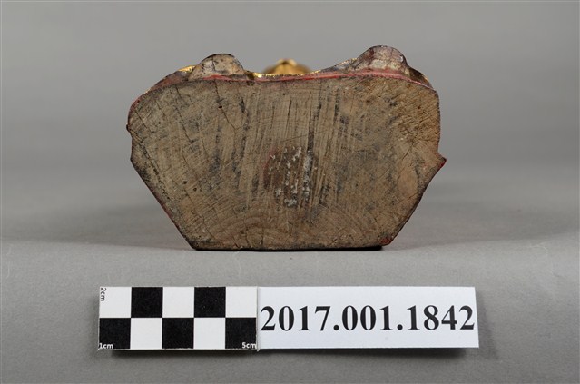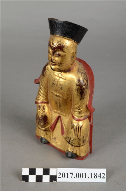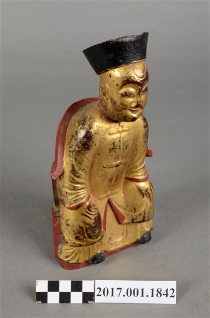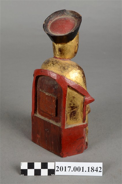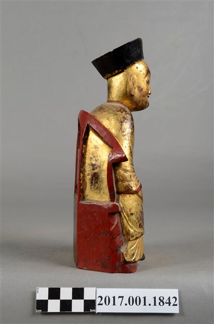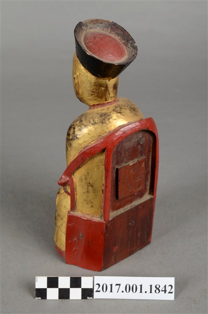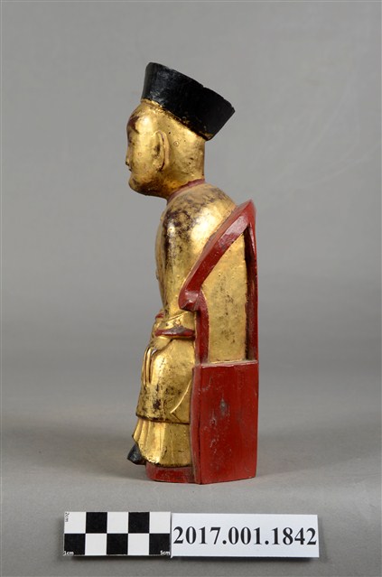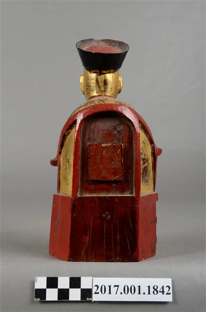 1.本件木雕祖先像,採坐姿姿態,表面施作安金粧佛、塗裝技法,背面於圈背椅的椅背處開有方形入神洞,封榫尚存。祖先像作男子相貌,有明顯抬頭紋。作清朝官員扮相,頭戴官員冬季佩戴的暖帽,身著馬褂,腳穿皂靴,坐於圈背椅上。挺身端坐,雙足垂下,雙手分置於腿上。本件祖先像無辮子,推測為民國時期所塑造的祖先像。