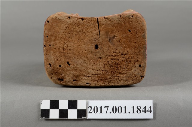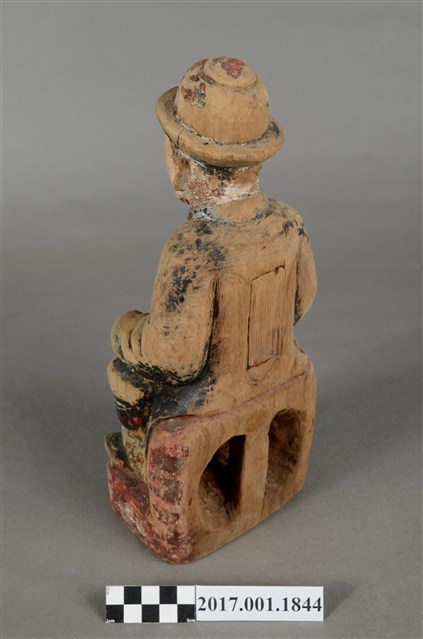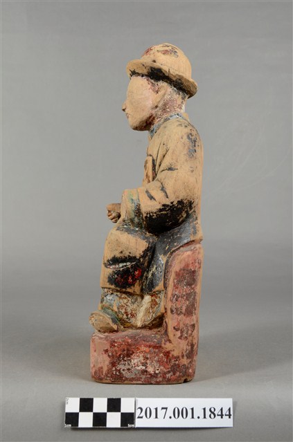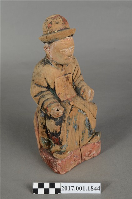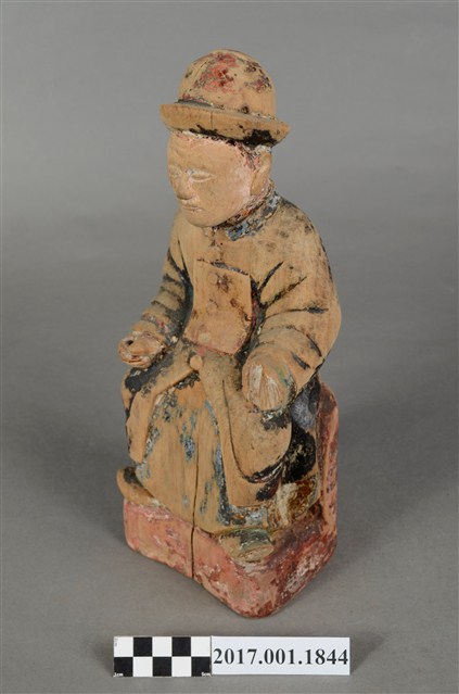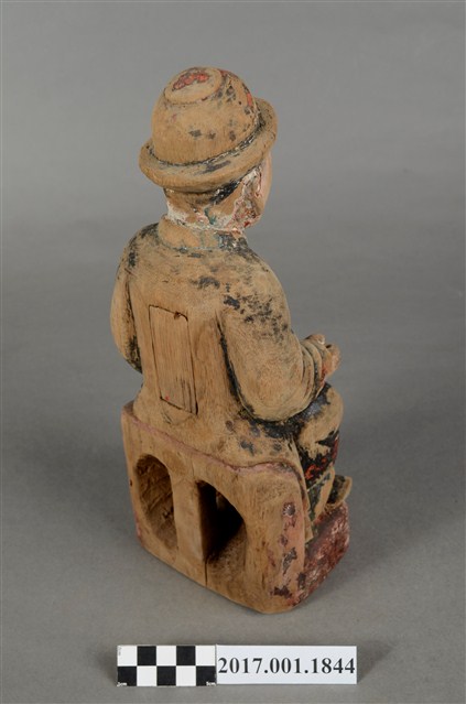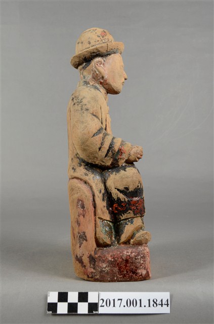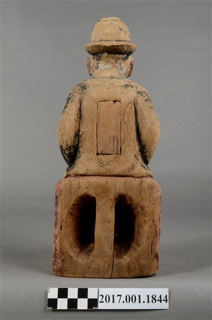1.本件木雕祖先像,採坐姿姿態,表面粧佛已除去,背面開有長方形入神洞,封榫尚存。祖先像作男子相貌,無鬚。作清朝官員扮相,頭戴官員冬季佩戴的暖帽,身著馬褂,馬掛上有補子,端坐於臺座上。挺身端坐,雙足垂下,雙手分置腿上,左手掌已削除,右手握拳。