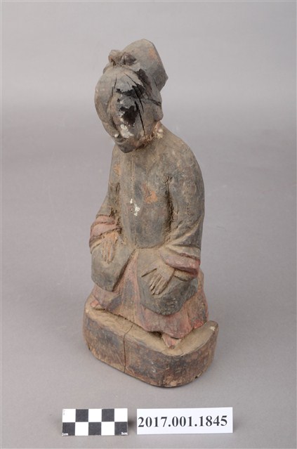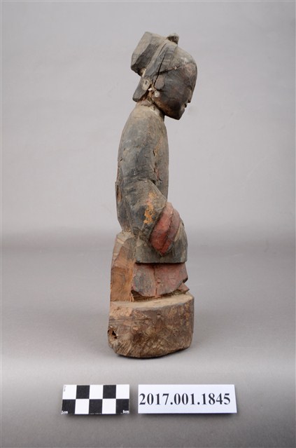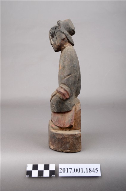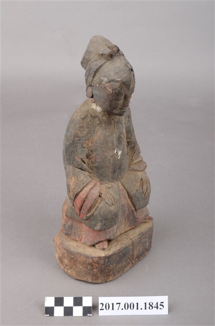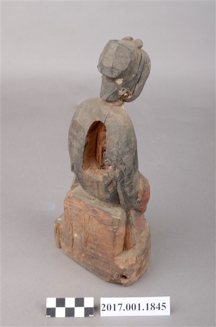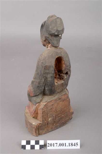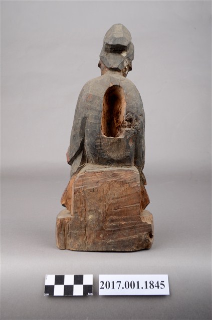 1.本件木雕祖先像,外表施作塗裝,局部漆面剝落,背面開有橢圓形入神洞,封榫佚失,內容物件已取出。臉型輪廓橢圓,頭部微側,面帶微笑,部分顏面遭到削除。髮梳髻,身著窄袖衫,腳穿弓鞋,坐於臺座上。挺身端坐,雙足垂下,雙手分置腿上。