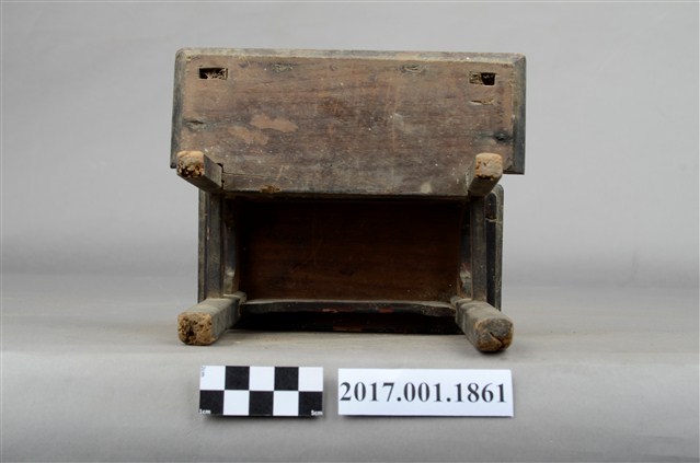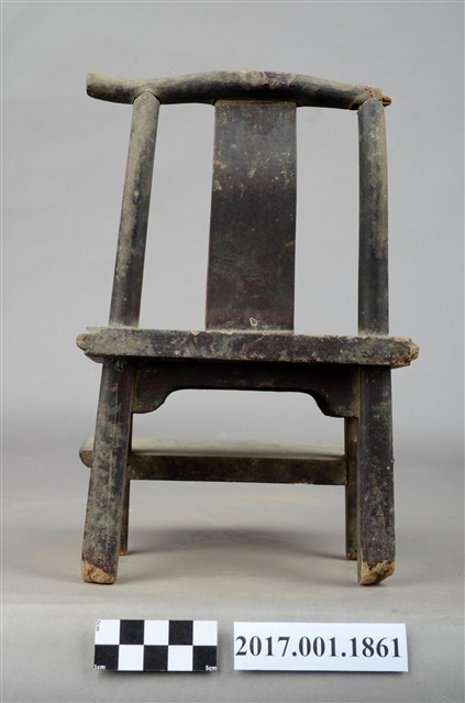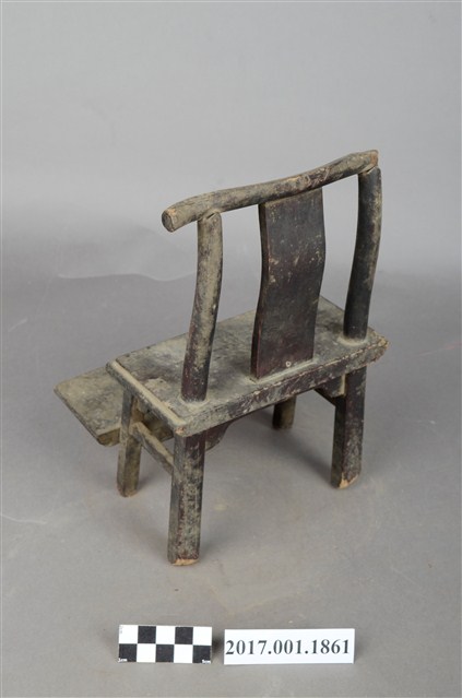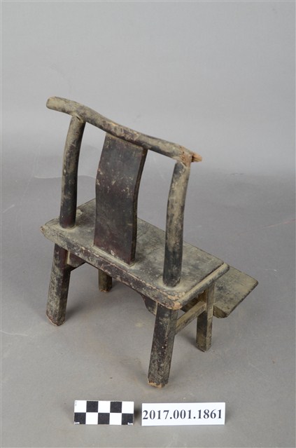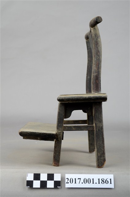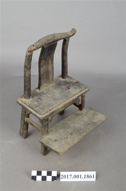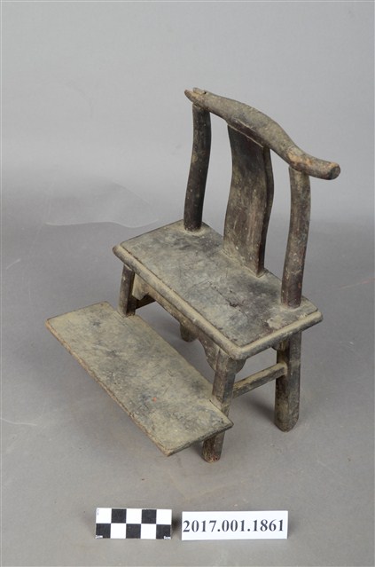 1.本件木雕座椅,表面施作塗裝。座椅款式為無扶手的二出頭燈掛椅,椅背的左側搭腦損毀,座椅前腿銜接踏几,踏几的前二足脫落。
