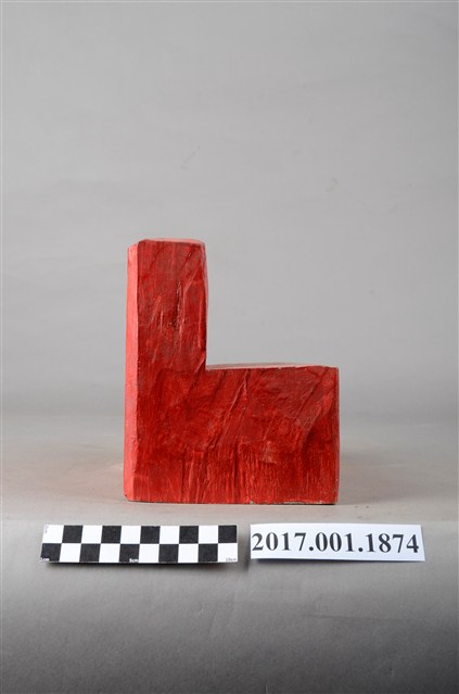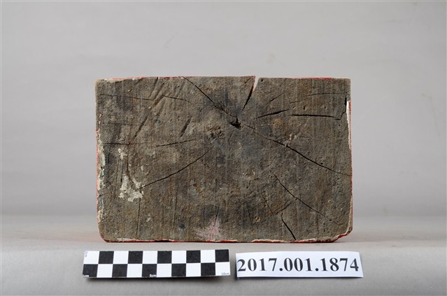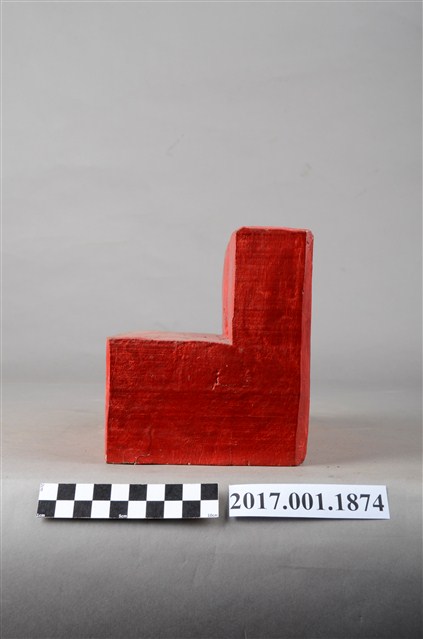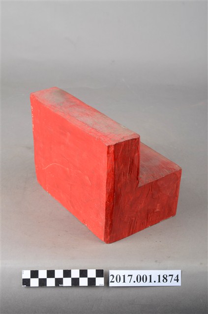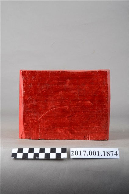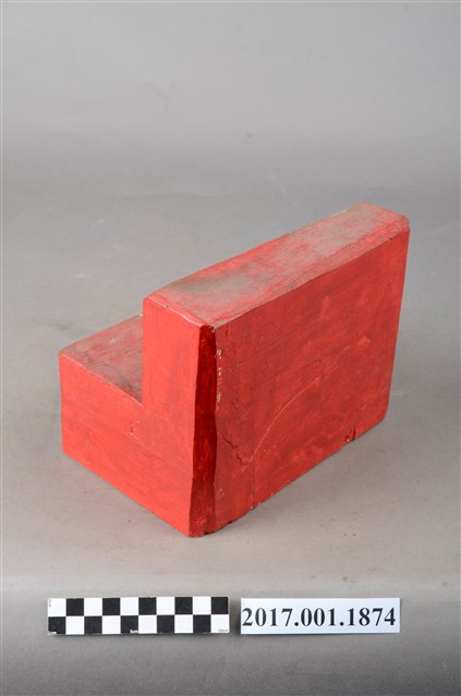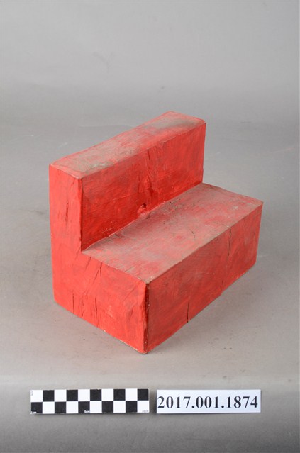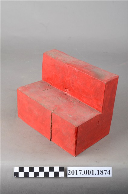 1.本件木雕臺座,表面平塗紅漆,取材的關係使得表面出現裂痕。臺座作雙層階梯狀,區分為上下兩層,上層為座椅,上下層正面作左右較寬之長方形,上下層高度略同。