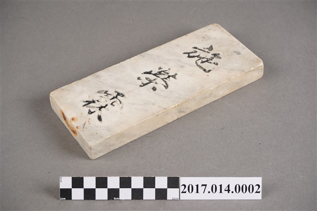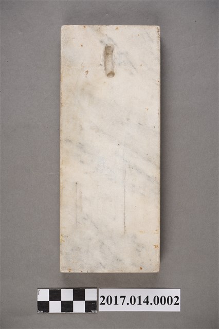 1. 本件為捐贈者老家日本時代時懸掛於大門旁或上方的戶長名牌,以白色略帶灰色紋理之大理石材質製造,外型呈扁平長方體,表面平整光華,正面有「施榮霖」楷體黑字,背面無字,近上方有一長條型掛溝,便於懸掛於門釘上。 2. 臺灣於日治時期總督府為了方便管理戶政,要求每家每戶都要在正門口,掛上戶長的姓名供辨識,戰後改朝換代,門牌才改以地址呈現。