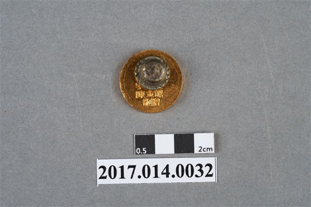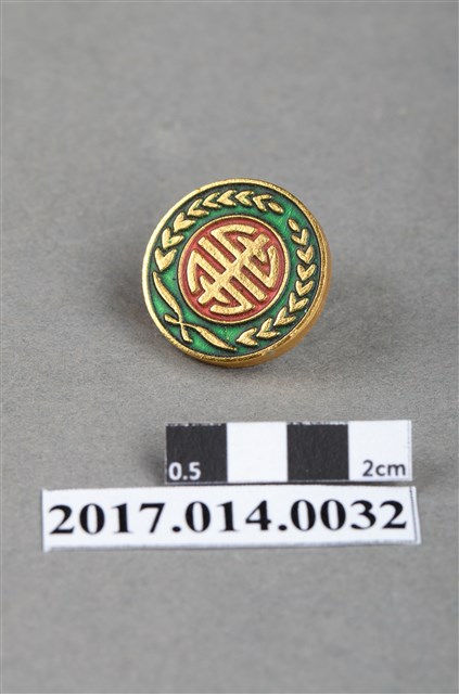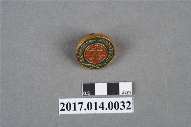 金綠色圓形紀念章,中央為金色壽字紋,外環為稻穗圖案。