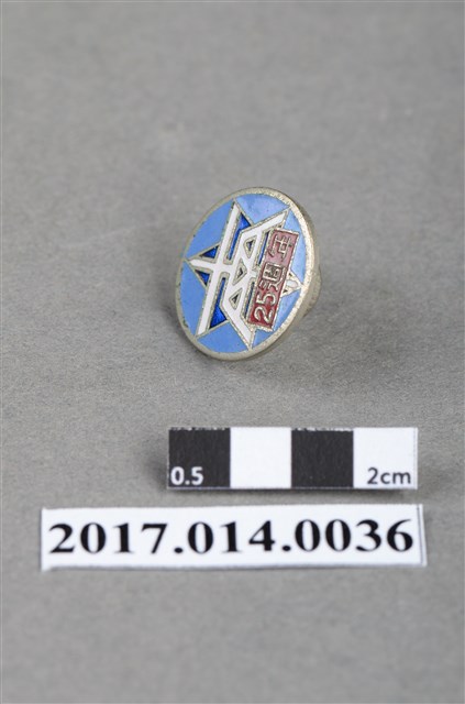 藍白紅三色圓形紀念章,中央有白色「南」及紅色「25週年」字樣。