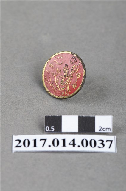 紅色圓形紀念章,徽章上有金色「中一中」字樣及祥龍圖案,推測為臺中一中之紀念章