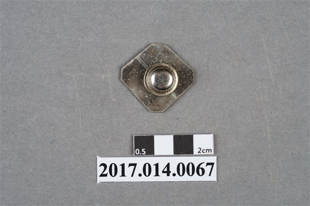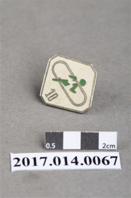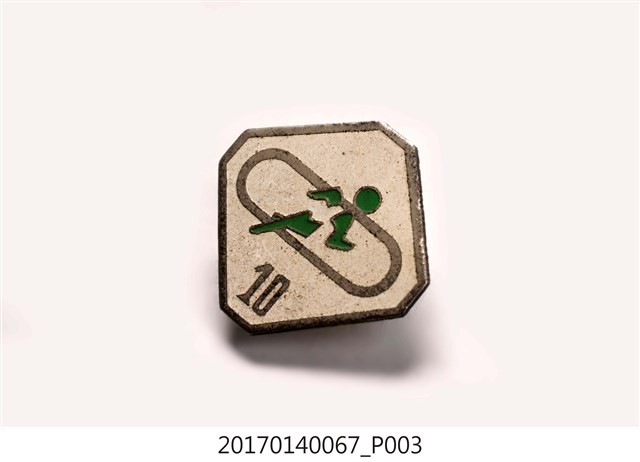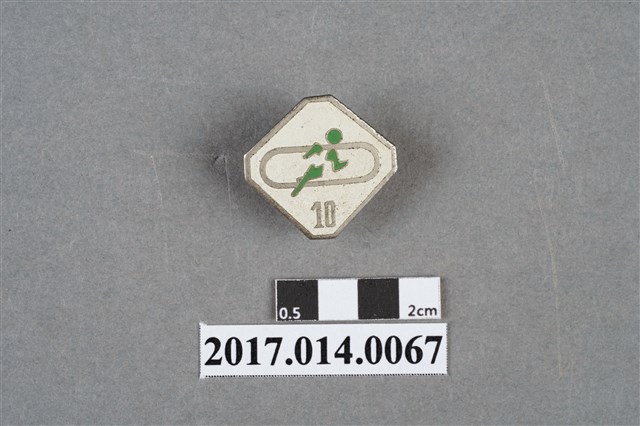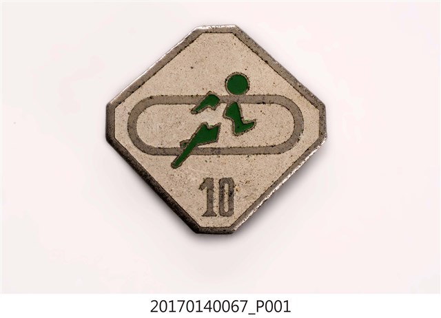 菱形白色紀念章,中央有一綠色跑者、及銀色跑道圖案、數字「10」字樣。推測為田徑比賽紀念徽章,本件與105051-0174相同。